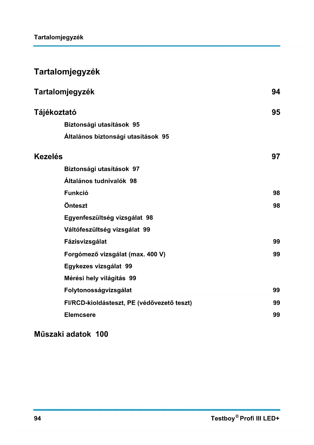 Profi III LED+ Tartalomjegyzék Tartalomjegyzék 94 Tájékoztató 95 Biztonsági utasítások 95 Általános biztonsági utasítások 95 Kezelés 97 Biztonsági utasítások 97 Általános tudnivalók 98 Funkció 98 Önteszt 98 Egyenfeszültség vizsgálat 98 Váltófeszültség vizsgálat 99 Fázisvizsgálat 99 Forgómező vizsgálat (max. 400 V) 99 Egykezes vizsgálat 99 Mérési hely világítás 99 Folytonosságvizsgálat 99 FI/RCD-kioldásteszt, PE (védővezető teszt) 99 Elemcsere 99 Műszaki adatok 100Tájékoztató Testboy
