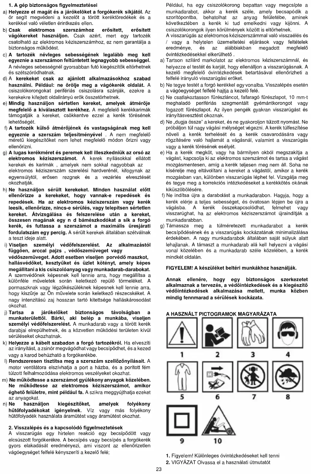 A visszarúgás egy hirtelen reakció egy becsípődött vagy elcsúszott forgókerékre. A becsípés vagy becsípés a forgókerék gyors elakadását eredményezi, ami viszont az ellenőrizetlen vágóegységet felfelé kényszeríti a kezelő felé; Például, ha egy csiszolókorong bepattan vagy megcsípte a munkadarabot, akkor a kerék széle, amely becsapódik a szorítópontba, behatolhat az anyag felületébe, aminek következtében a kerék ki tud emelkedni vagy kijönni. A csiszolókorongok ilyen körülmények között is eltörhetnek. A visszarúgás az elektromos kéziszerszámmal való visszaélés és / vagy a helytelen üzemeltetési eljárások vagy feltételek eredménye, és az alábbiakban megadott megfelelő óvintézkedésekkel elkerülhető . a) Tartson szilárd markolatot az elektromos kéziszerszámnál, és helyezze el testét és karját, hogy ellenálljon a visszarúgásnak. A kezelő megfelelő óvintézkedések betartásával ellenőrizheti a felfelé irányuló visszarúgási erőket. b) Ne tegye testét a forgó kerékkel egy vonalba. Visszalépés esetén a vágóegységet felfelé hajtja a kezelõ felé. c) Ne csatlakoztasson fűrészláncot, fafaragó fűrészlapot, 10 mm-t meghaladó perifériás szegmentált gyémántkorongot vagy fogazott fűrészlapot. Az ilyen pengék gyakran visszarúgást és irányításvesztést okoznak. d) Ne „dugja össze” a kereket, és ne gyakoroljon túlzott nyomást. Ne próbáljon túl nagy vágási mélységet végezni. A kerék túlfeszítése növeli a kerék terhelését és a kerék csavarodására vagy rögzítésére való hajlamát a vágásnál, valamint a visszarúgás vagy a kerék törésének esélyét. e) Ha a kerék megköt, vagy ha bármilyen okból megszakítja a vágást, kapcsolja ki az elektromos szerszámot és tartsa a vágást mozgásmentesen, amíg a kerék teljesen meg nem áll. Soha ne kísérelje meg eltávolítani a kereket a vágástól, amikor a kerék mozgásban van, különben visszarúgás léphet fel. Vizsgálja meg és tegye meg a korrekciós intézkedéseket a kerékkötés okának kiküszöbölésére. f) Ne indítsa újra a darabolást a munkadarabon. Hagyja, hogy a kerék elérje a teljes sebességet, és óvatosan lépjen be újra a vágásba. A kerék összekapcsolódhat, felmehet vagy visszarúghat, ha az elektromos kéziszerszámot újraindítják a munkadarabban. g) Támassza meg a túlméretezett munkadarabot a kerék becsípődésének és a visszarúgás kockázatának minimalizálása érdekében. A nagy munkadarabok általában saját súlyuk alatt lehajlanak. A támaszt a munkadarab alá kell helyezni a vágási vonal közelében és a munkadarab széle közelében, a kerék mindkét oldalán. FIGYELEM! A készüléket beltéri munkákhoz használják. Annak ellenére, hogy egy biztonságos szerkezetet alkalmaznak a tervezés, a védőintézkedések és a kiegészítő védőintézkedések alkalmazása mellett, munka közben mindig fennmarad a sérülések kockázata.