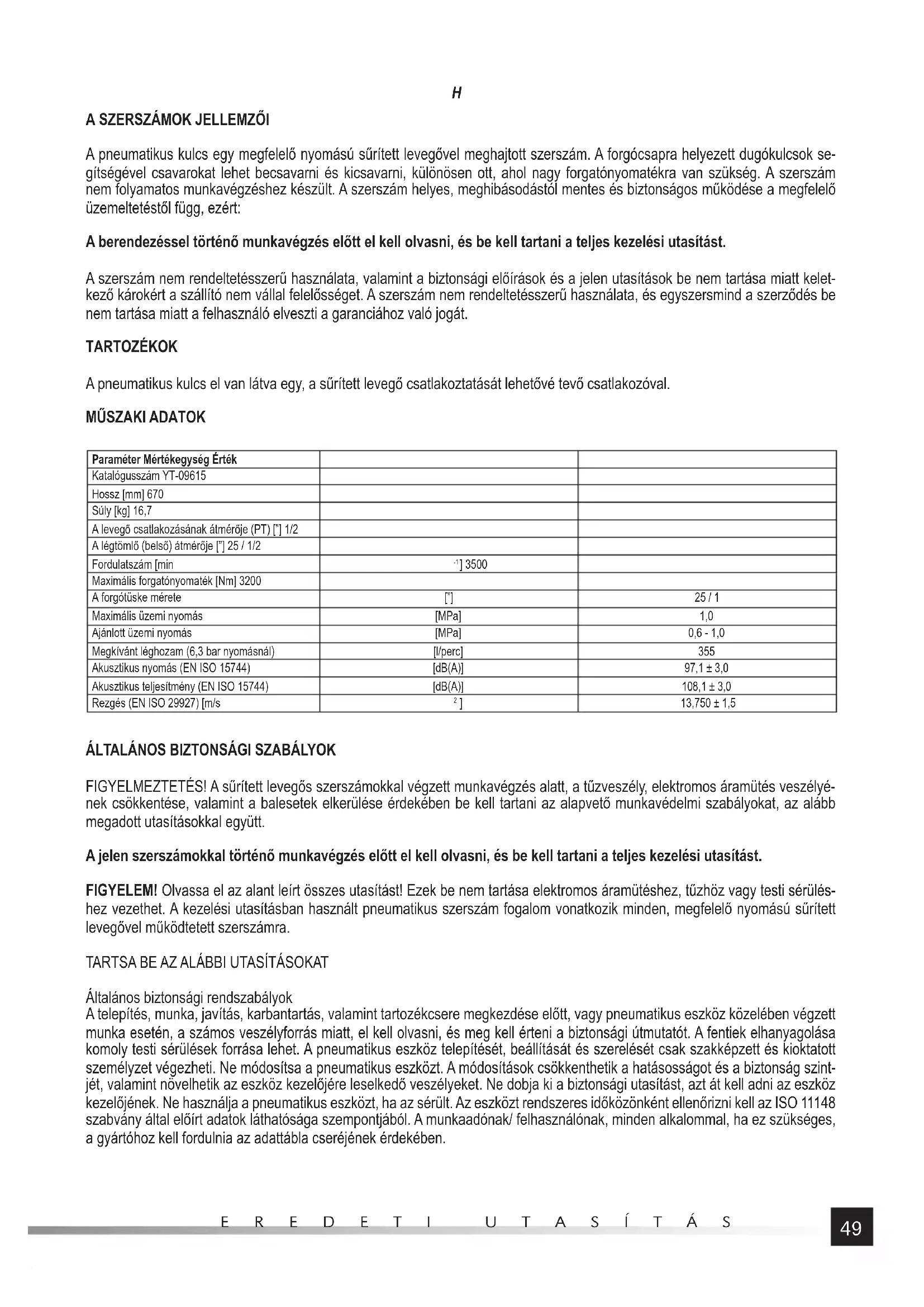 FIGYELMEZTETÉS! A sűrített levegős szerszámokkal végzett munkavégzés alatt, a tűzveszély, elektromos áramütés veszélyé- nek csökkentése, valamint a balesetek elkerülése érdekében be kell tartani az alapvető munkavédelmi szabályokat, az alább megadott utasításokkal együtt. A jelen szerszámokkal történő munkavégzés előtt el kell olvasni, és be kell tartani a teljes kezelési utasítást. FIGYELEM! Olvassa el az alant leírt összes utasítást! Ezek be nem tartása elektromos áramütéshez, tűzhöz vagy testi sérülés- hez vezethet. A kezelési utasításban használt pneumatikus szerszám fogalom vonatkozik minden, megfelelő nyomású sűrített levegővel működtetett szerszámra. TARTSA BE AZ ALÁBBI UTASÍTÁSOKAT Általános biztonsági rendszabályok A telepítés, munka, javítás, karbantartás, valamint tartozékcsere megkezdése előtt, vagy pneumatikus eszköz közelében végzett munka esetén, a számos veszélyforrás miatt, el kell olvasni, és meg kell érteni a biztonsági útmutatót. A fentiek elhanyagolása komoly testi sérülések forrása lehet. A pneumatikus eszköz telepítését, beállítását és szerelését csak szakképzett és kioktatott személyzet végezheti. Ne módosítsa a pneumatikus eszközt. A módosítások csökkenthetik a hatásosságot és a biztonság szint- jét, valamint növelhetik az eszköz kezelőjére leselkedő veszélyeket. Ne dobja ki a biztonsági utasítást, azt át kell adni az eszköz kezelőjének. Ne használja a pneumatikus eszközt, ha az sérült. Az eszközt rendszeres időközönként ellenőrizni kell az ISO 11148 szabvány által előírt adatok láthatósága szempontjából. A munkaadónak/ felhasználónak, minden alkalommal, ha ez szükséges, a gyártóhoz kell fordulnia az adattábla cseréjének érdekében.50