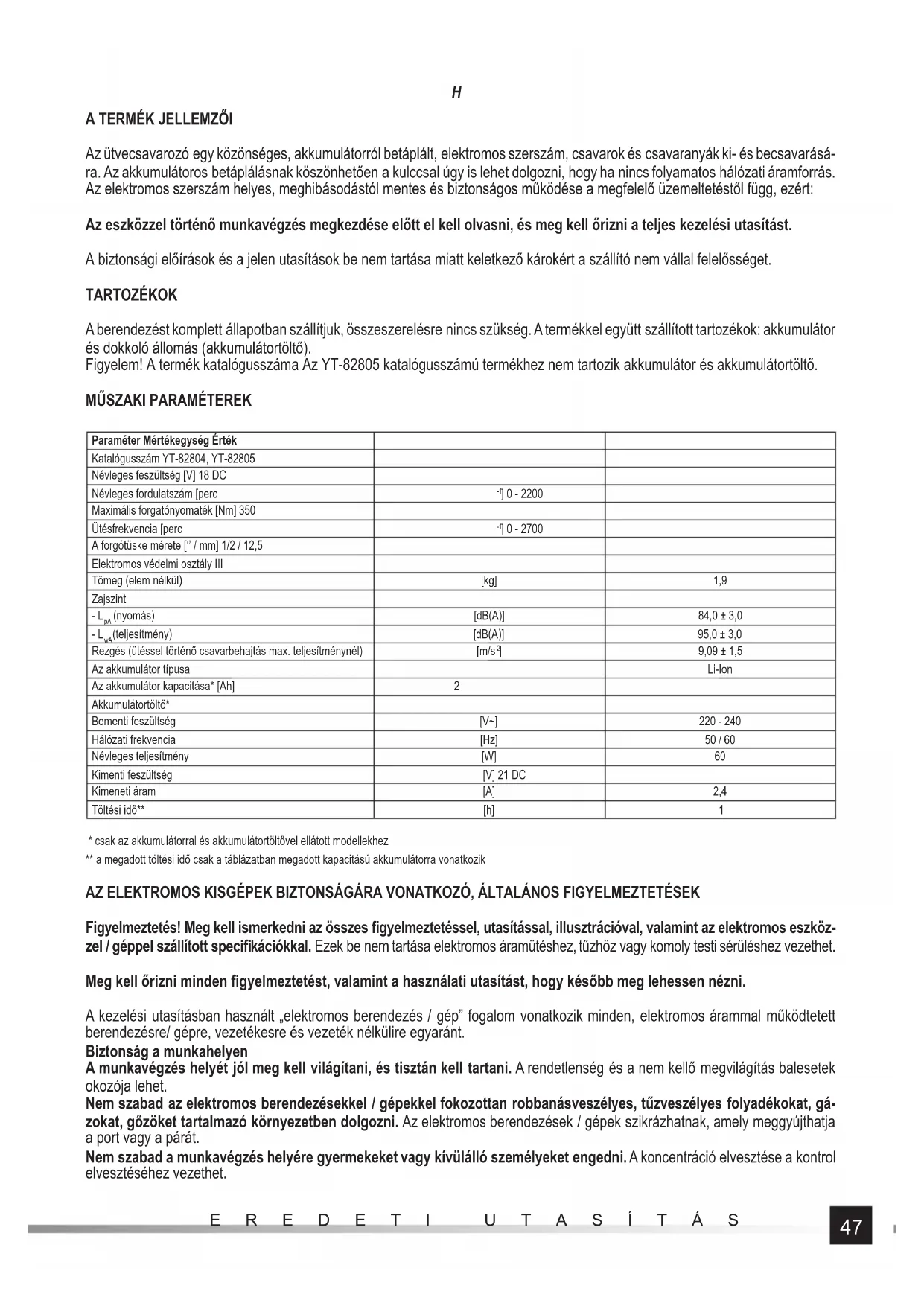 Az ütvecsavarozó egy közönséges, akkumulátorról betáplált, elektromos szerszám, csavarok és csavaranyák ki- és becsavarásá- ra. Az akkumulátoros betáplálásnak köszönhetően a kulccsal úgy is lehet dolgozni, hogy ha nincs folyamatos hálózati áramforrás. Az elektromos szerszám helyes, meghibásodástól mentes és biztonságos működése a megfelelő üzemeltetéstől függ, ezért: Az eszközzel történő munkavégzés megkezdése előtt el kell olvasni, és meg kell őrizni a teljes kezelési utasítást. A biztonsági előírások és a jelen utasítások be nem tartása miatt keletkező károkért a szállító nem vállal felelősséget. TARTOZÉKOK A berendezést komplett állapotban szállítjuk, összeszerelésre nincs szükség. A termékkel együtt szállított tartozékok: akkumulátor és dokkoló állomás (akkumulátortöltő). Figyelem! A termék katalógusszáma Az YT-82805 katalógusszámú termékhez nem tartozik akkumulátor és akkumulátortöltő.