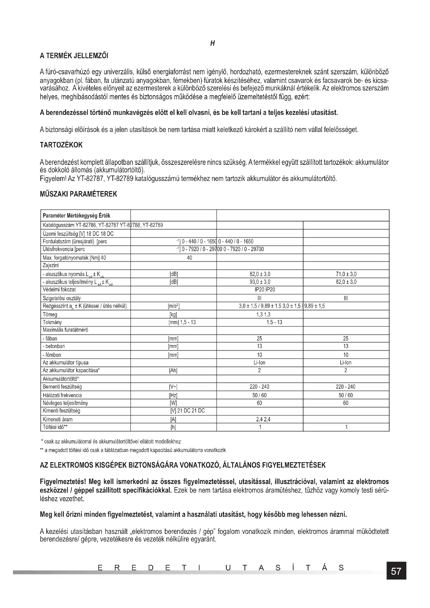 - csak az akkumulátorral és akkumulátortöltővel ellátott modellekhez ** a megadott töltési idő csak a táblázatban megadott kapacitású akkumulátorra vonatkozik AZ ELEKTROMOS KISGÉPEK BIZTONSÁGÁRA VONATKOZÓ, ÁLTALÁNOS FIGYELMEZTETÉSEK Figyelmeztetés! Meg kell ismerkedni az összes fi gyelmeztetéssel, utasítással, illusztrációval, valamint az elektromos eszközzel / géppel szállított specifi kációkkal. Ezek be nem tartása elektromos áramütéshez, tűzhöz vagy komoly testi sérü- léshez vezethet. Meg kell őrizni minden fi gyelmeztetést, valamint a használati utasítást, hogy később meg lehessen nézni. A kezelési utasításban használt „elektromos berendezés / gép” fogalom vonatkozik minden, elektromos árammal működtetett berendezésre/ gépre, vezetékesre és vezeték nélkülire egyaránt.58