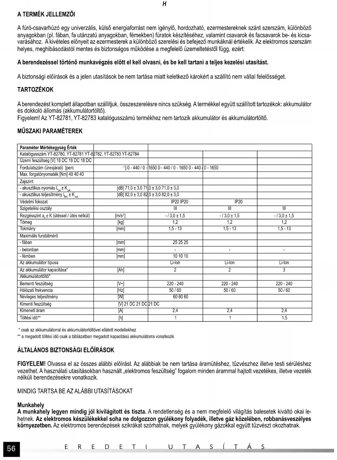 - csak az akkumulátorral és akkumulátortöltővel ellátott modellekhez ** a megadott töltési idő csak a táblázatban megadott kapacitású akkumulátorra vonatkozik ÁLTALÁNOS BIZTONSÁGI ELŐÍRÁSOK FIGYELEM! Olvassa el az összes alábbi előírást. Az alábbiak be nem tartása áramütéshez, tűzvészhez illetve testi sérüléshez vezethet. A használati utasításokban használt „elektromos feszültség” fogalom minden árammal hajtott vezetékes, illetve vezeték nélküli berendezésekre vonatkozik. MINDIG TARTSA BE AZ ALÁBBI UTASÍTÁSOKAT Munkahely A munkahely legyen mindig jól kivilágított és tiszta. A rendetlenség és a nem megfelelő világítás balesetek kiváltó okai le- hetnek. Az elektromos készülékekkel soha ne dolgozzon gyúlékony folyadék, illetve gáz közelében, robbanásveszélyes környezetben. Az elektromos berendezések szikrákat szórhatnak, melyek gyúlékony gázokkal együtt tűzvészt okozhatnak.57