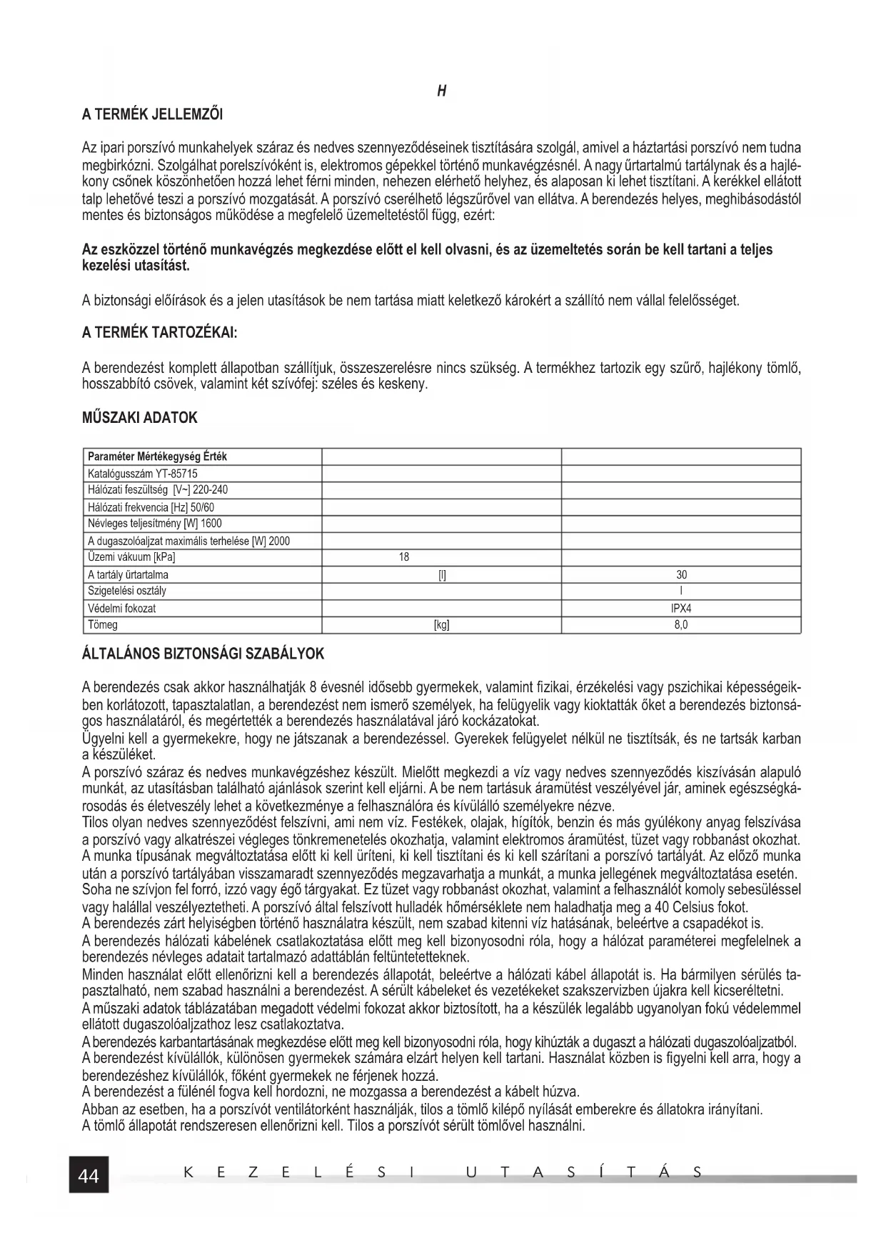 Paraméter Mértékegység Érték Katalógusszám YT-85715 Hálózati feszültség [V~] 220-240 Hálózati frekvencia [Hz] 50/60 Névleges teljesítmény [W] 1600 A dugaszolóaljzat maximális terhelése [W] 2000 Üzemi vákuum [kPa] 18 A tartály űrtartalma [l] 30 Szigetelési osztály I Védelmi fokozat IPX4 Tömeg [kg] 8,0