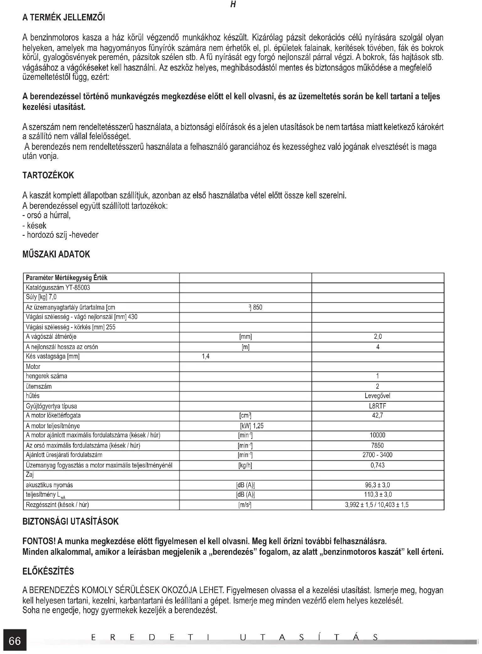 FONTOS! A munka megkezdése előtt fi gyelmesen el kell olvasni. Meg kell őrizni további felhasználásra. Minden alkalommal, amikor a leírásban megjelenik a „berendezés” fogalom, az alatt „benzinmotoros kaszát” kell érteni.
