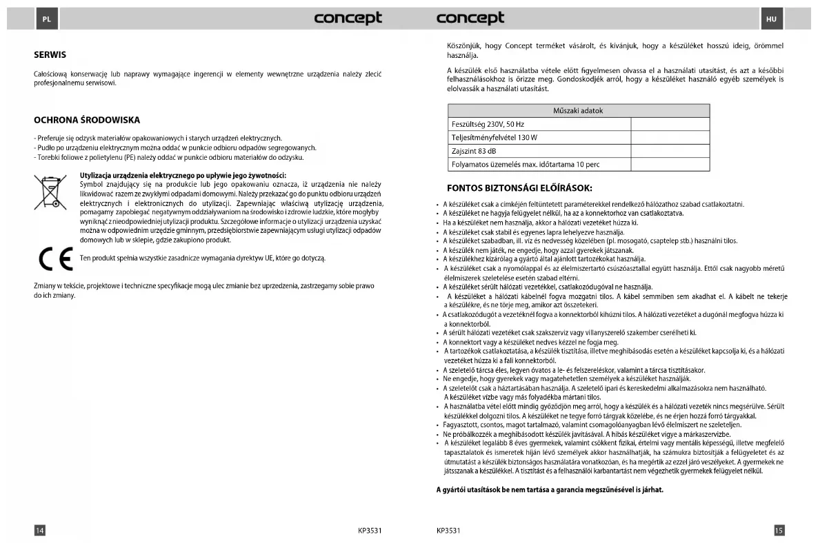 PLPL 1312 KP3531KP3531HU 13KP3530 Köszönjük, hogy Concept terméket vásárolt, és kívánjuk, hogy a készüléket hosszú ideig, örömmel használja. A készülék első használatba vétele előtt gyelmesen olvassa el a használati utasítást, és azt a későbbi felhasználásokhoz is őrizze meg. Gondoskodjék arról, hogy a készüléket használó egyéb személyek is elolvassák a használati utasítást. Műszaki adatok Feszültség 230V, 50 Hz Teljesítményfelvétel 130 W Zajszint 83 dB Folyamatos üzemelés max. időtartama 10 perc FONTOS BIZTONSÁGI ELŐÍRÁSOK: