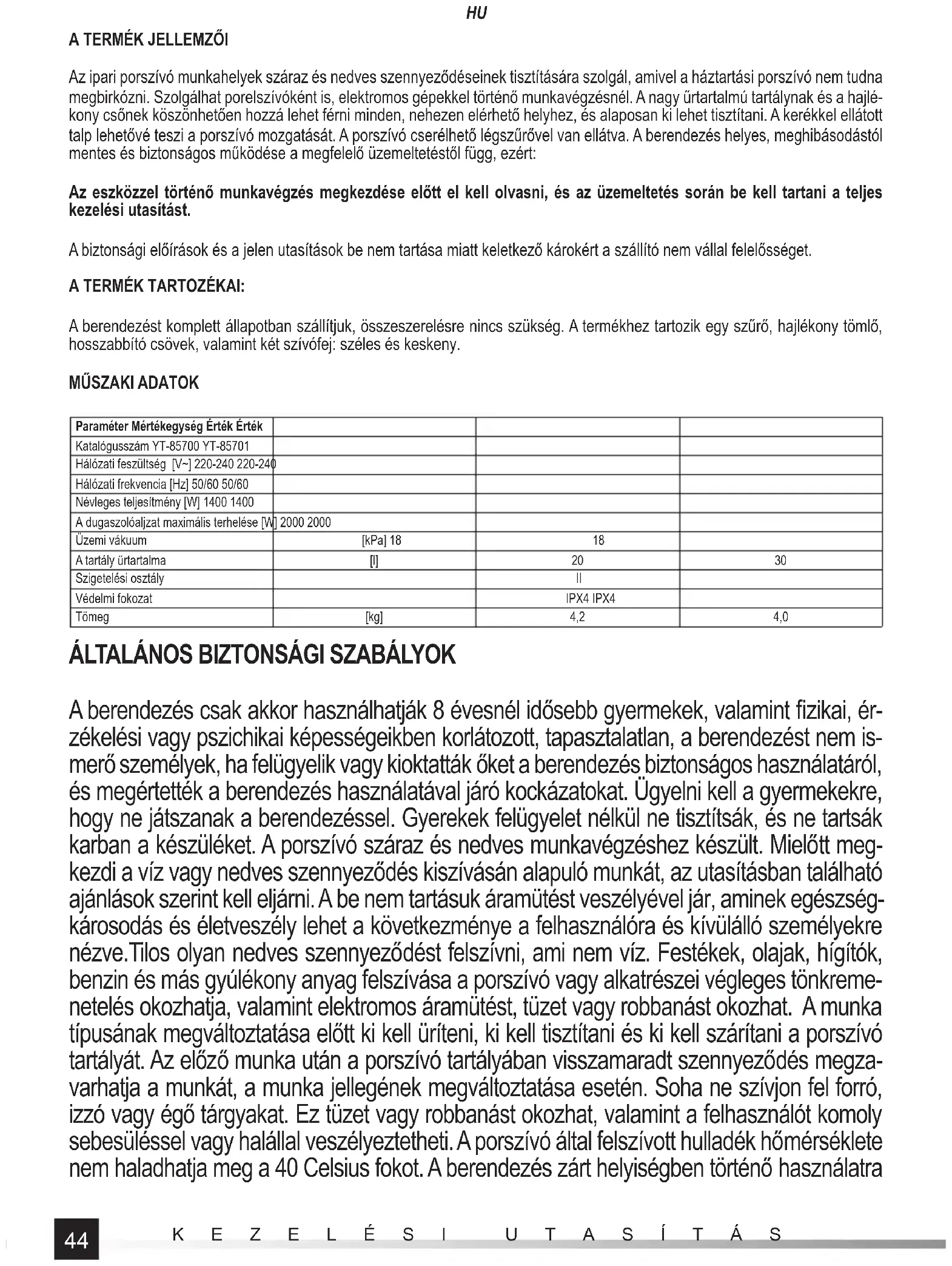 Paraméter Mértékegység Érték Érték Katalógusszám YT-85700 YT-85701 Hálózati feszültség [V~] 220-240 220-240 Hálózati frekvencia [Hz] 50/60 50/60 Névleges teljesítmény [W] 1400 1400 A dugaszolóaljzat maximális terhelése [W] 2000 2000 Üzemi vákuum [kPa] 18 18 A tartály űrtartalma [l] 20 30 Szigetelési osztály II Védelmi fokozat IPX4 IPX4 Tömeg [kg] 4,2 4,0