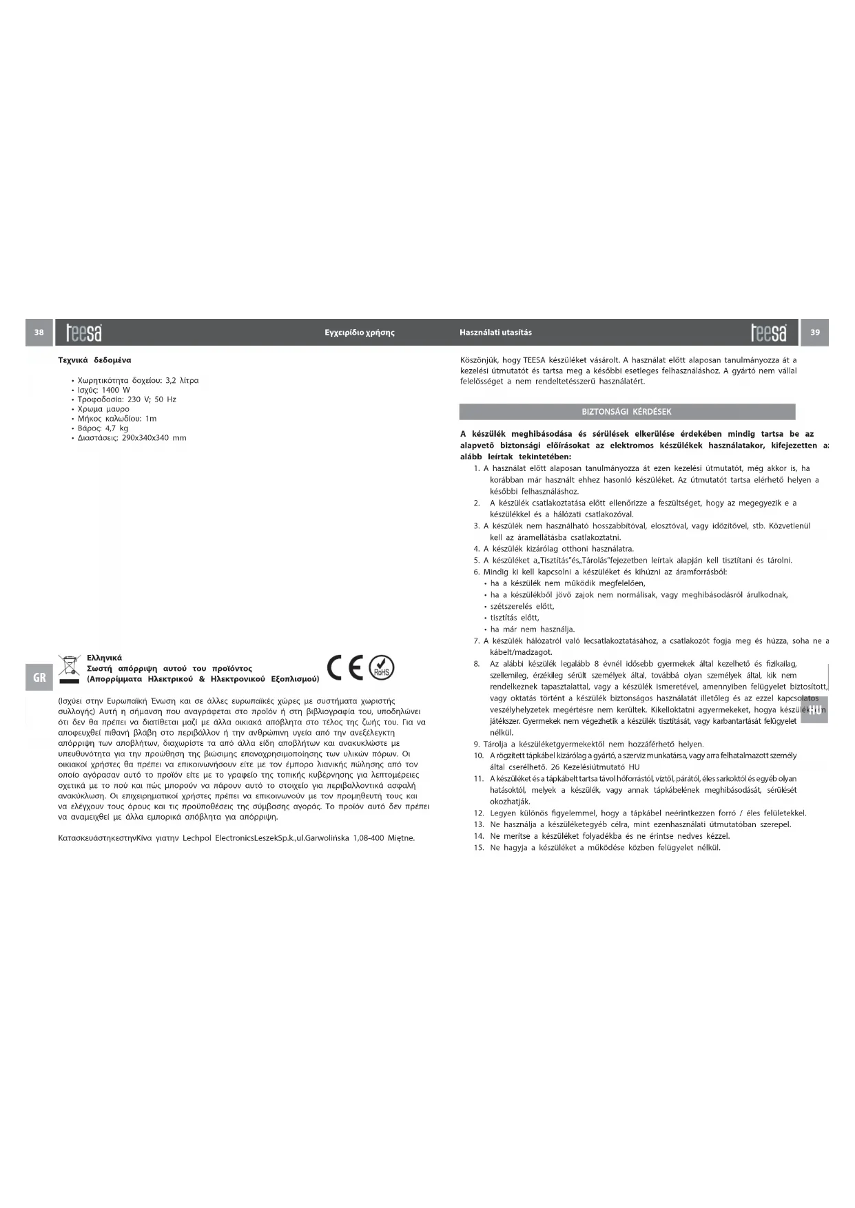 Köszönjük, hogy TEESA készüléket vásárolt. A használat előtt alaposan tanulmányozza át a kezelési útmutatót és tartsa meg a későbbi esetleges felhasználáshoz. A gyártó nem vállal felelősséget a nem rendeltetésszerű használatért. 38 39Εγχειρίδιο χρήσης Εγχειρίδιο χρήσης GR GR 38 39Használati utasítás Használati utasítás HU HUFONTOS