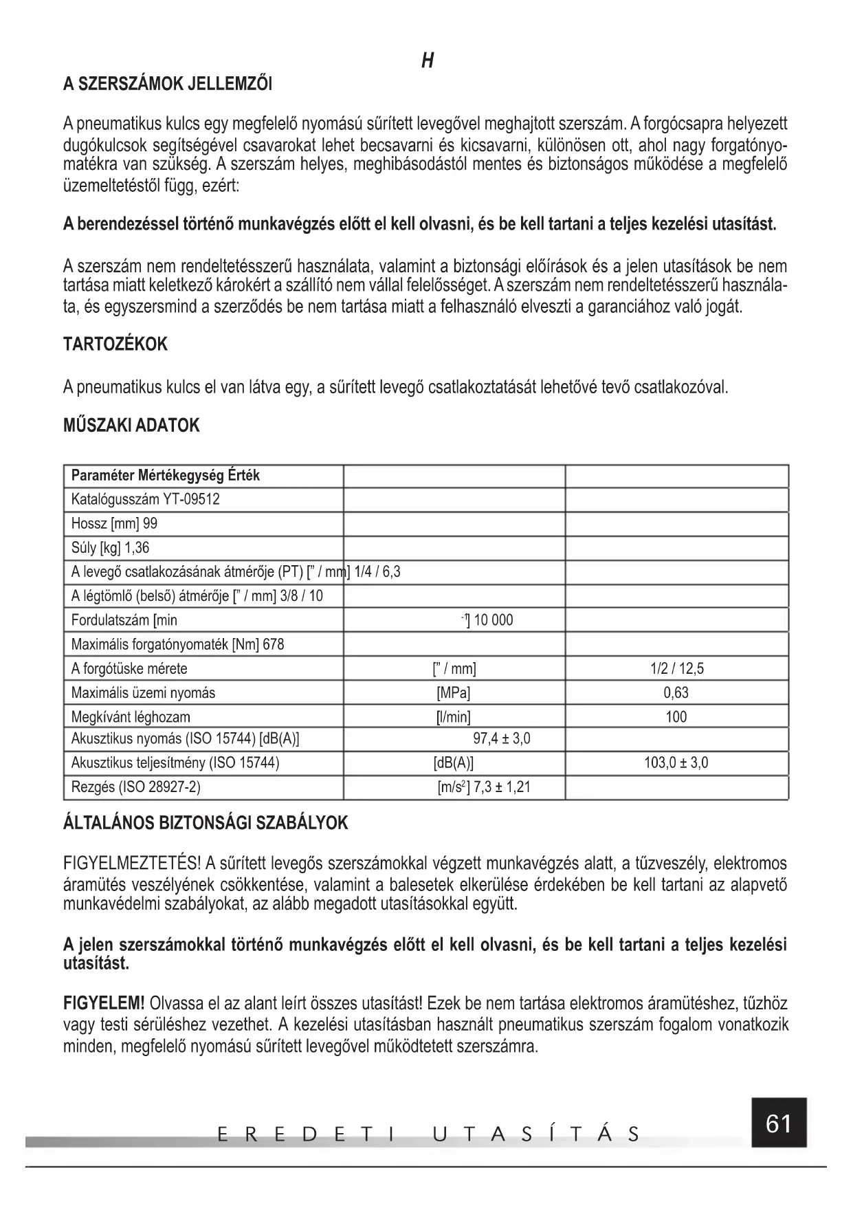 FIGYELMEZTETÉS! A sűrített levegős szerszámokkal végzett munkavégzés alatt, a tűzveszély, elektromos áramütés veszélyének csökkentése, valamint a balesetek elkerülése érdekében be kell tartani az alapvető munkavédelmi szabályokat, az alább megadott utasításokkal együtt. A jelen szerszámokkal történő munkavégzés előtt el kell olvasni, és be kell tartani a teljes kezelési utasítást. FIGYELEM! Olvassa el az alant leírt összes utasítást! Ezek be nem tartása elektromos áramütéshez, tűzhöz vagy testi sérüléshez vezethet. A kezelési utasításban használt pneumatikus szerszám fogalom vonatkozik minden, megfelelő nyomású sűrített levegővel működtetett szerszámra.H