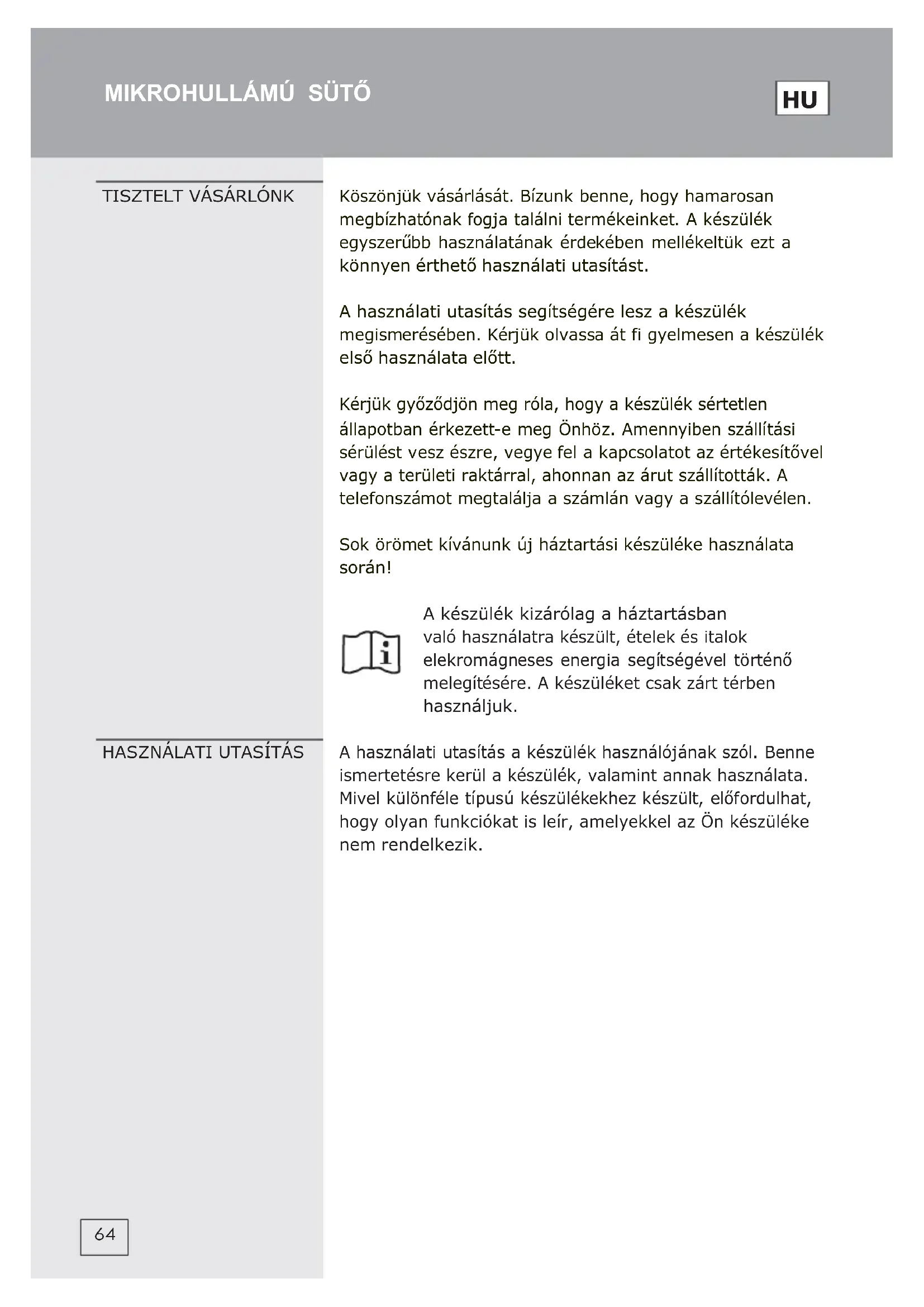 Köszönjük vásárlását. Bízunk benne, hogy hamarosan megbízhatónak fogja találni termékeinket. A készülék egyszerűbb használatának érdekében mellékeltük ezt a könnyen érthető használati utasítást. A használati utasítás segítségére lesz a készülék megismerésében. Kérjük olvassa át fi gyelmesen a készülék első használata előtt. Kérjük győződjön meg róla, hogy a készülék sértetlen állapotban érkezett-e meg Önhöz. Amennyiben szállítási sérülést vesz észre, vegye fel a kapcsolatot az értékesítővel vagy a területi raktárral, ahonnan az árut szállították. A telefonszámot megtalálja a számlán vagy a szállítólevélen. Sok örömet kívánunk új háztartási készüléke használata során! A készülék kizárólag a háztartásban való használatra készült, ételek és italok elekromágneses energia segítségével történő melegítésére. A készüléket csak zárt térben használjuk.