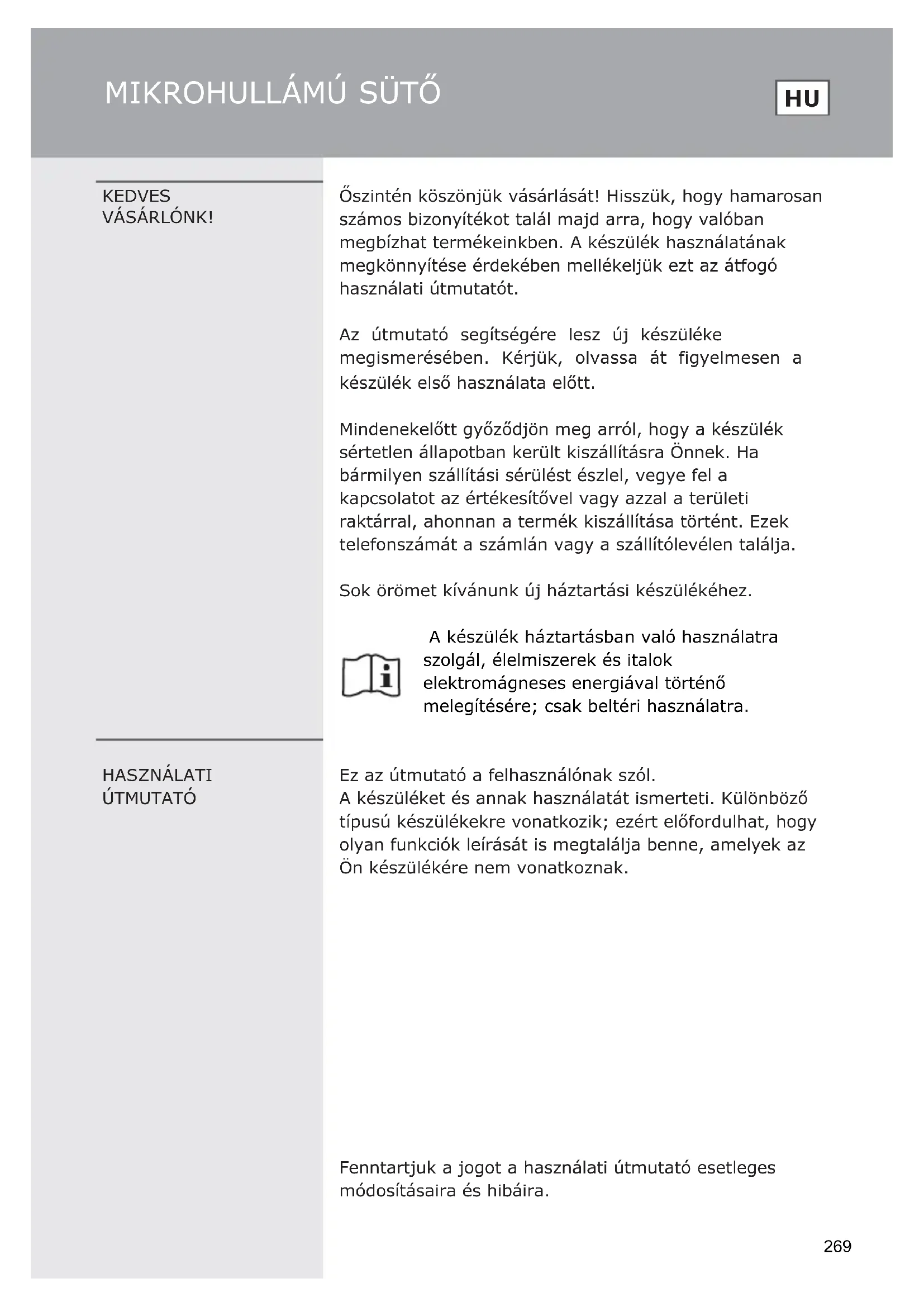 KEDVES VÁSÁRLÓNK! Őszintén köszönjük vásárlását! Hisszük, hogy hamarosan számos bizonyítékot talál majd arra, hogy valóban megbízhat termékeinkben. A készülék használatának megkönnyítése érdekében mellékeljük ezt az átfogó használati útmutatót. Az útmutató segítségére lesz új készüléke megismerésében. Kérjük, olvassa át figyelmesen a készülék első használata előtt. Mindenekelőtt győződjön meg arról, hogy a készülék sértetlen állapotban került kiszállításra Önnek. Ha bármilyen szállítási sérülést észlel, vegye fel a kapcsolatot az értékesítővel vagy azzal a területi raktárral, ahonnan a termék kiszállítása történt. Ezek telefonszámát a számlán vagy a szállítólevélen találja. Sok örömet kívánunk új háztartási készülékéhez. A készülék háztartásban való használatra szolgál, élelmiszerek és italok elektromágneses energiával történő melegítésére; csak beltéri használatra. HASZNÁLATI ÚTMUTATÓ Ez az útmutató a felhasználónak szól. A készüléket és annak használatát ismerteti. Különböző típusú készülékekre vonatkozik; ezért előfordulhat, hogy olyan funkciók leírását is megtalálja benne, amelyek az Ön készülékére nem vonatkoznak. Fenntartjuk a jogot a használati útmutató esetleges módosításaira és hibáira.