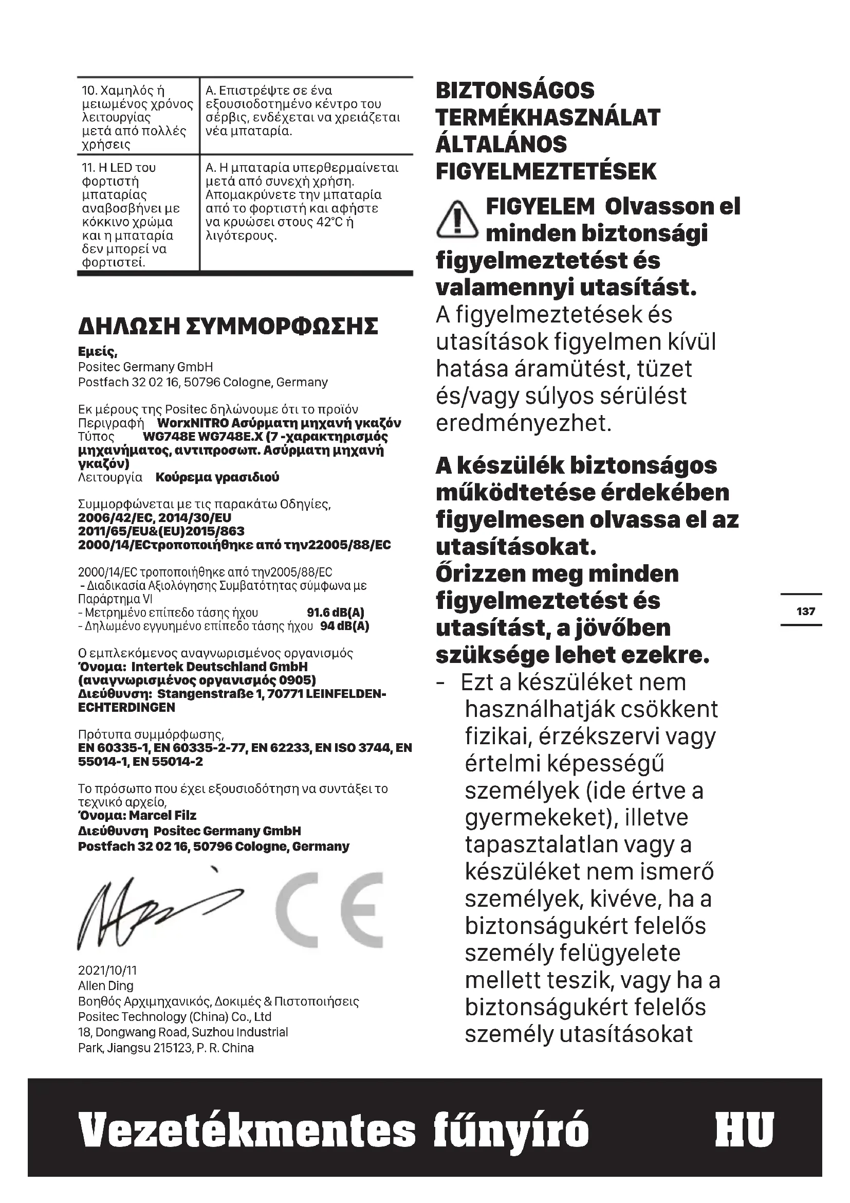 ¢μ: Marcel Filz Δ Positec Germany GmbH Postfach 32 02 16, 50796 Cologne, Germany 2021/10/11 Allen Ding |`[ %+μ%+`[, Δ+μ$[ & +++[ Positec Technology (China) Co., Ltd 18, Dongwang Road, Suzhou Industrial Park, Jiangsu 215123, P. R. China138 Vezetékmentes fűnyíró HU ad nekik a készülék használatára vonatkozóan. - Felügyelje a gyermekeket, hogy ne játszhassanak a készülékkel. - A készülék kizárólag a vele együtt szállított táppal használható. FONTOS