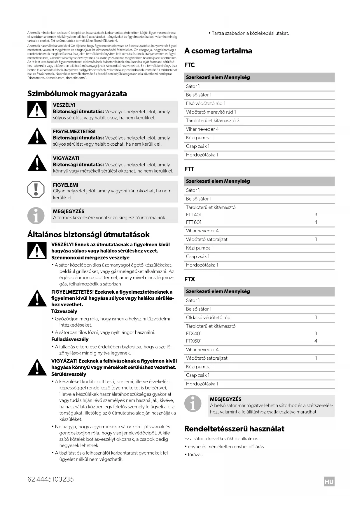- túrázás VESZÉLY! Biztonsági útmutatás: Veszélyes helyzetet jelöl, amely súlyos sérülést vagy halált okoz, ha nem kerülik el. FIGYELMEZTETÉS! Biztonsági útmutatás: Veszélyes helyzetet jelöl, amely súlyos sérülést vagy halált okozhat, ha nem kerülik el. VIGYÁZAT! Biztonsági útmutatás: Veszélyes helyzetet jelöl, amely könnyű vagy mérsékelt sérülést okozhat, ha nem kerülik el. FIGYELEM! Olyan helyzetet jelöl, amely vagyoni kárt okozhat, ha nem kerülik el. MEGJEGYZÉS A termék kezelésére vonatkozó kiegészítő információk. Szerkezeti elem Mennyiség Sátor 1 Belső sátor 1 Első védőtető rúd 1 Védőtető merevítő rúd 1 Tárolóterület kitámasztó 3 Vihar heveder 4 Kézi pumpa 1 Csap zsák 1 Hordozótáska 1 Szerkezeti elem Mennyiség Sátor 1 Belső sátor 1 Tárolóterület kitámasztó FTT401 FTT601