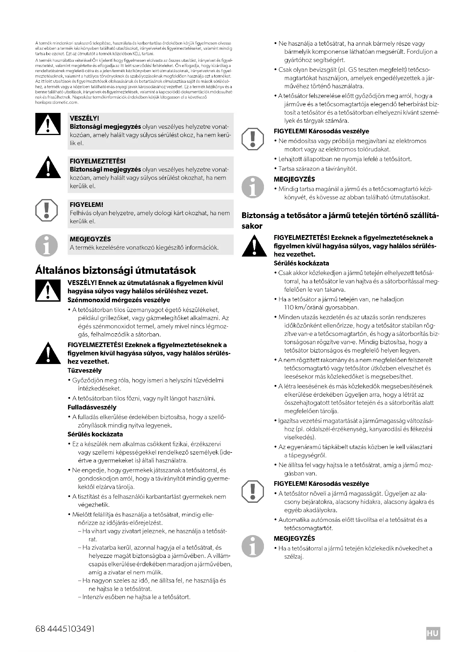 - Ha a tetősátorral a jármű tetején közlekedik növekedhet a szélzaj. VESZÉLY! Biztonsági megjegyzés olyan veszélyes helyzetre vonat- kozóan, amely halált vagy súlyos sérülést okoz, ha nem kerü- lik el. FIGYELMEZTETÉS! Biztonsági megjegyzés olyan veszélyes helyzetre vonat- kozóan, amely halált vagy súlyos sérülést okozhat, ha nem kerülik el. FIGYELEM! Felhívás olyan helyzetre, amely dologi kárt okozhat, ha nem kerülik el. MEGJEGYZÉS A termék kezelésére vonatkozó kiegészítő információk.HU