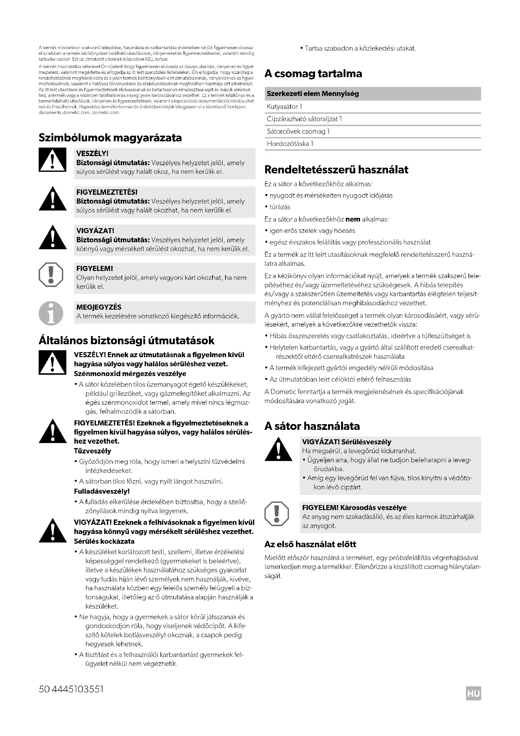 Az első használat előtt Mielőtt először használná a terméket, egy próbafelállítás végrehajtásával ismerkedjen meg a termékkel. Ellenőrizze a kiszállított csomag hiánytalan- ságát. VESZÉLY! Biztonsági útmutatás: Veszélyes helyzetet jelöl, amely súlyos sérülést vagy halált okoz, ha nem kerülik el. FIGYELMEZTETÉS! Biztonsági útmutatás: Veszélyes helyzetet jelöl, amely súlyos sérülést vagy halált okozhat, ha nem kerülik el. VIGYÁZAT! Biztonsági útmutatás: Veszélyes helyzetet jelöl, amely könnyű vagy mérsékelt sérülést okozhat, ha nem kerülik el. FIGYELEM! Olyan helyzetet jelöl, amely vagyoni kárt okozhat, ha nem kerülik el. MEGJEGYZÉS A termék kezelésére vonatkozó kiegészítő információk. Szerkezeti elem Mennyiség Kutyasátor 1 Cipzárazható sátoraljzat 1 Sátorcövek csomag 1 Hordozótáska 1 VIGYÁZAT! Sérülésveszély Ha megsérül, a levegőrúd kidurranhat.