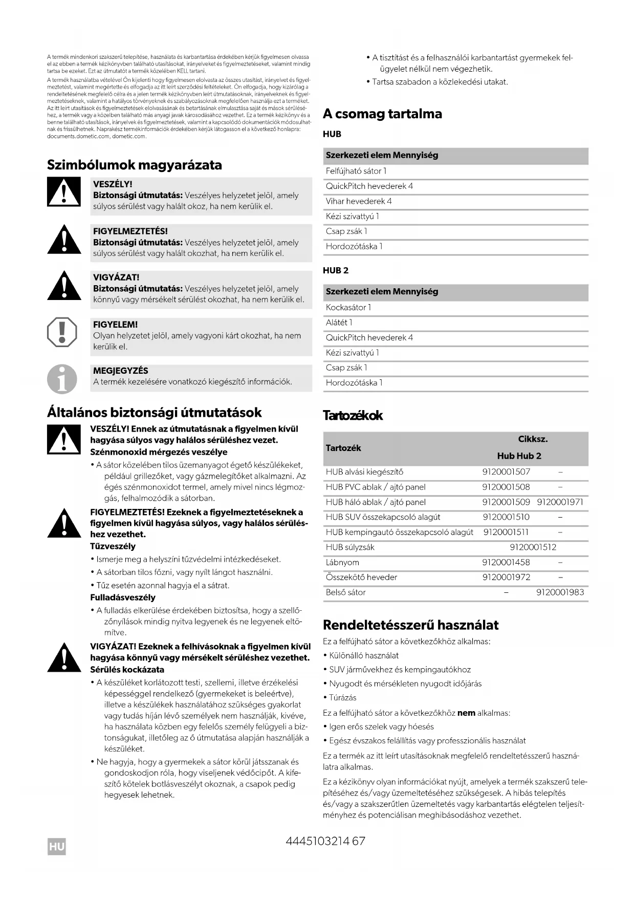 - Egész évszakos felállítás vagy professzionális használat Ez a termék az itt leírt utasításoknak megfelelő rendeltetésszerű haszná- latra alkalmas. Ez a kézikönyv olyan információkat nyújt, amelyek a termék szakszerű tele- pítéséhez és/vagy üzemeltetéséhez szükségesek. A hibás telepítés és/vagy a szakszerűtlen üzemeltetés vagy karbantartás elégtelen teljesít- ményhez és potenciálisan meghibásodáshoz vezethet. VESZÉLY! Biztonsági útmutatás: Veszélyes helyzetet jelöl, amely súlyos sérülést vagy halált okoz, ha nem kerülik el. FIGYELMEZTETÉS! Biztonsági útmutatás: Veszélyes helyzetet jelöl, amely súlyos sérülést vagy halált okozhat, ha nem kerülik el. VIGYÁZAT! Biztonsági útmutatás: Veszélyes helyzetet jelöl, amely könnyű vagy mérsékelt sérülést okozhat, ha nem kerülik el. FIGYELEM! Olyan helyzetet jelöl, amely vagyoni kárt okozhat, ha nem kerülik el. MEGJEGYZÉS A termék kezelésére vonatkozó kiegészítő információk. Szerkezeti elem Mennyiség Felfújható sátor 1 QuickPitch hevederek 4 Vihar hevederek 4 Kézi szivattyú 1 Csap zsák 1 Hordozótáska 1 Szerkezeti elem Mennyiség Kockasátor 1 Alátét 1 QuickPitch hevederek 4 Kézi szivattyú 1 Csap zsák 1 Hordozótáska 1 Tartozék Cikksz. Hub Hub 2 HUB alvási kiegészítő 9120001507 – HUB PVC ablak / ajtó panel 9120001508 – HUB háló ablak / ajtó panel 9120001509 9120001971 HUB SUV összekapcsoló alagút 9120001510 – HUB kempingautó összekapcsoló alagút 9120001511 – HUB súlyzsák 9120001512 Lábnyom 9120001458 – Összekötő heveder 9120001972 – Belső sátor – 9120001983HU