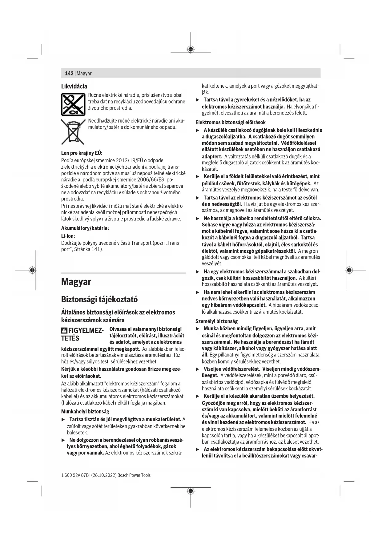 1,5 1,5 Az ezen utasításokban megadott rezgésszint és zajkibocsátá- si érték egy szabványban rögzített mérési módszerrel került meghatározásra és az elektromos kéziszerszámok egymással való összehasonlítására alkalmazható. Ez az érték a rezgés- és zajkibocsátás ideiglenes becslésére is alkalmas. A megadott rezgésszint és zajkibocsátási érték az elektro- mos kéziszerszám fő alkalmazásaira vonatkozik. Ha az elekt- romos kéziszerszámot más alkalmazásokra, eltérő betétszer- számokkal vagy nem kielégítő karbantartás mellett használ- ják, a rezgésszint és a zajkibocsátási érték a fenti értékektől eltérhet. Ez az egész munkaidőre vonatkozó rezgés- és zajki- bocsátást lényegesen megnövelheti. A rezgés- és zajkibocsátás pontos megbecsüléséhez figye- lembe kell venni azokat az időszakokat is, amikor a készülék kikapcsolt állapotban van, vagy amikor be van ugyan kap- csolva, de nem kerül ténylegesen használatra. Ez az egész munkaidőre vonatkozó rezgés- és zajkibocsátást lényegesen csökkentheti. Hozzon kiegészítő biztonsági intézkedéseket a kezelőnek a rezgések hatása elleni védelmére, például: Az elektromos ké- ziszerszám és a betétszerszámok karbantartása, a kezek me- legen tartása, a munkamenetek megszervezése. Akkumulátor A Bosch vállalat az akkumulátoros elektromos kéziszerszá- mokat akkumulátorok nélkül is árusítja. Azt, hogy az Ön elektromos kéziszerszámának szállítási terjedelme egy akku- mulátort is magában foglal-e, a csomagolásról lehet leolvas- ni. Az akkumulátor feltöltése u Csak a Műszaki Adatoknál megadott töltőkészüléke- ket használja. Csak ezek a töltőkészülékek felelnek meg pontosan az Ön elektromos kéziszerszámában alkalma- zásra kerülő Li‑ion-akkumulátornak. Figyelem: A lítium-ion-akkumulátorok a nemzetközi szállítási előírásoknak megfelelően csak részben feltöltve kerülnek ki- szállításra. Az akkumulátor teljes teljesítményének biztosítá- sára az első alkalmazás előtt töltse fel teljesen az akkumulá- tort. Az akkumulátor beszerelése Tolja be a feltöltött akkumulátort az akkumulátor fogadó egy- ségbe, amíg az érezhetően bepattan. Az akkumulátor kivétele Az akkumulátor eltávolításához nyomja meg az akkumulátor reteszelésfeloldó gombot és húzza ki az akkumulátort. Ne erőltesse a kihúzást. Az akkumulátor 2reteszelővállal van ellátva, amelyek meggá- tolják, hogy az akkumulátor az akkumulátor reteszelésfeloldó gomb akaratlan megnyomásakor kiessen. Amíg az akkumulá- tor be van helyezve az elektromos kéziszerszámba, azt egy rugó a helyén tartja. Akkumulátor töltöttségi szint kijelző Az akkumulátor töltési szint kijelző display zöld LED-jei az ak- kumulátor töltési szintjét mutatják. A töltöttségi szintet biz- tonsági okokból csak használaton kívüli elektromos kéziszer- szám esetén lehet lekérdezni. Nyomja meg a vagy a feltöltési szint kijelző gombot, hogy kijelezze a töltési szintet. Erre kivett akkumulátor ese- tén is van lehetőség. Ha az akkumulátor feltöltési szint kijelző gomb megnyomása után egy LED sem világít, az akkumulátor meghibásodott és ki kell cserélni. Akkumulátor típus: GBA 18V... LED Kapacitás Tartós fény, 3×zöld 60–100% Tartós fény, 2×zöld 30–60% Tartós fény, 1×zöld 5–30% Villogó fény, 1×zöld 0–5% Akkumulátor típus: ProCORE18V... LED Kapacitás Tartós fény, 5×zöld 80–100% 1 609 92A 87B | (28.10.2022) Bosch Power ToolsMagyar | 147 LED Kapacitás Tartós fény, 4×zöld 60–80% Tartós fény, 3×zöld 40–60% Tartós fény, 2×zöld 20–40% Tartós fény, 1×zöld 5–20% Villogó fény, 1×zöld 0–5% Tájékoztató az akkumulátor optimális kezeléséhez Óvja meg az akkumulátort a nedvességtől és a víztől. Az akkumulátort csak a –20°C...50°C hőmérséklet tarto- mányban szabad tárolni. Ne hagyja például az akkumulátort nyáron egy gépjárműben. Időnként tisztítsa meg az akkumulátor szellőzőrését egy pu- ha, tiszta és száraz ecsettel. Ha az akkumulátor feltöltése után a készülék már csak lénye- gesen rövidebb ideig üzemeltethető, akkor az akkumulátor elhasználódott és ki kell cserélni. Vegye figyelembe a hulladékba való eltávolítással kapcsola- tos előírásokat. Összeszerelés u Az elektromos kéziszerszámon végzendő minden munka (például karbantartás, szerszámcsere, stb.) megkezdése előtt, valamint szállításhoz és tároláshoz vegye ki az akkumulátort az elektromos kéziszerszám- ból. Ellenkező esetben a be‑/kikapcsoló véletlen megérin- tésekor bekapcsolódó készülék sérüléseket okozhat. A fűrészlap behelyezése/kicserélése u A betétszerszámfelszereléséhez vagy kicseréléséhez viseljen védőkesztyűt. A betétszerszámok élesek és hosszabb használat esetén felforrósodhatnak. A fűrészlap kijelölése A javasolt fűrészlapok áttekintése ezen útmutató végén talál- ható. Csak egy-bütykös szárú (T-szár) fűrészlapokat használ- jon. A fűrészlap ne legyen hosszabb, mint amire az előirány- zott vágáshoz szükség van. Kis sugarú görbék vágásához használjon keskeny fűrészla- pot. A fűrészlap behelyezése (lásd aAábrát) u A behelyezés előtt tisztítsa meg a fűrészlap szárát. Egy elszennyeződött szárat nem lehet biztonságosan rög- zíteni. Nyomja be ütközésig és tartsa benyomva a (3)SDS-kart. Tol- ja bele a (17)fűrészlapot a fogakkal a vágási irányban ütkö- zésig a (2)fűrészlap befogó egységbe. A fúrészlap behelyezésekor ügyeljen arra, hogy a fűrészlap hátsó éle belefeküdjön a (16) vájatába. u Ellenőrizze a fűrészlap szilárd rögzítését. Egy laza fű- részlap kieshet és sérüléseket okozhat. A fűrészlap kivétele (lásd aBábrát) Nyomja előre ütközésig a (3)SDS-ka
