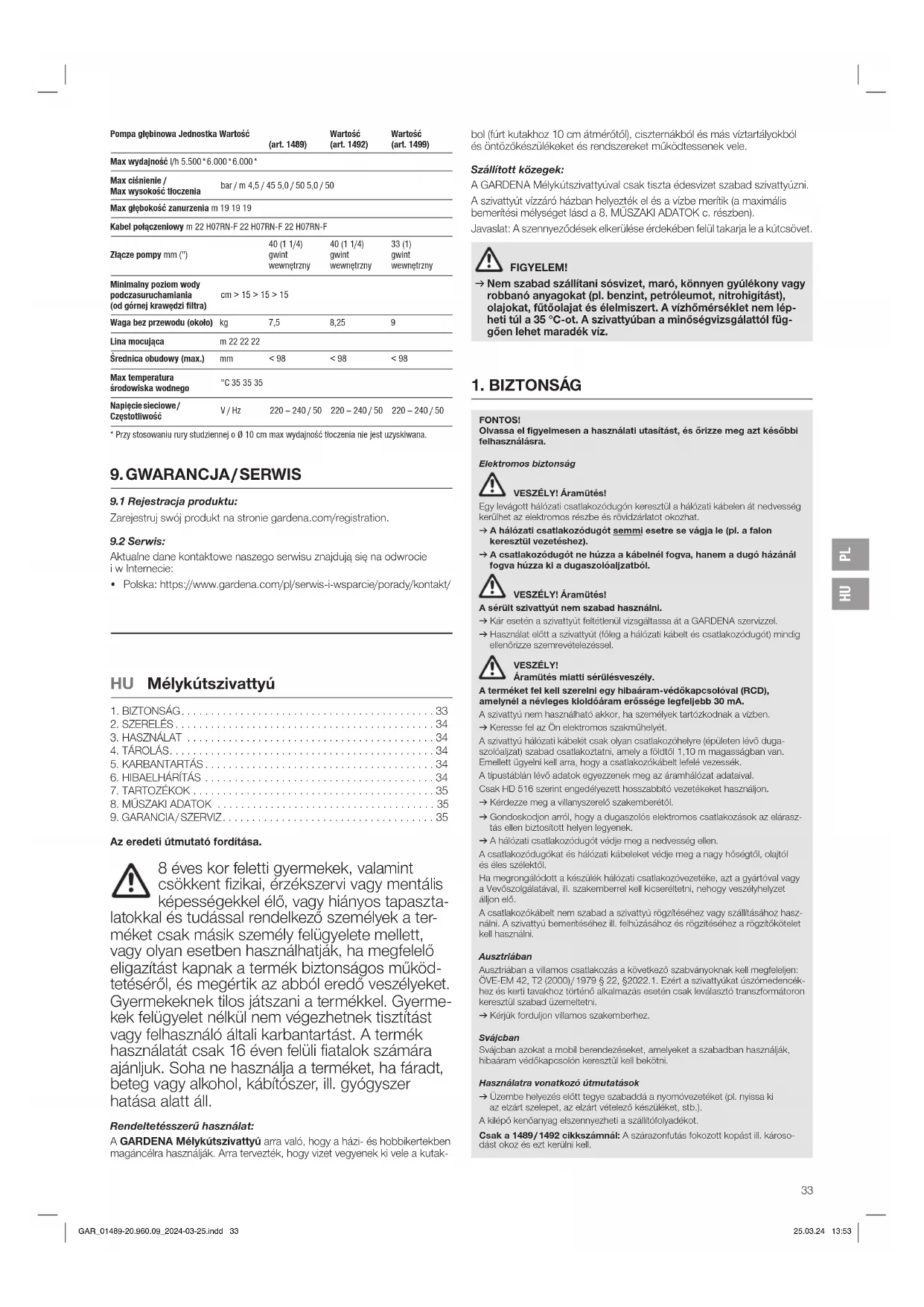 bol (fúrt kutakhoz 10 cm átmérőtől), ciszternákból és más víztartályokból és öntözőkészülékeket és rendszereket működtessenek vele. Szállított közegek: A GARDENA Mélykútszivattyúval csak tiszta édesvizet szabad szivattyúzni. A szivattyút vízzáró házban helyezték el és a vízbe merítik (a maximális bemerítési mélységet lásd a 8. MŰSZAKI ADATOK c. részben). Javaslat: A szennyeződések elkerülése érdekében felül takarja le a kútcsövet. FIGYELEM! v Nem szabad szállítani sósvizet, maró, könnyen gyúlékony vagy robbanó anyagokat (pl. benzint, petróleumot, nitrohigítást), olajokat, fűtőolajat és élelmiszert. A vízhőmér sékletnem lép- heti túl a 35 °C-ot. A szivattyúban a minőségvizsgálattól füg- gően lehet maradék víz. GAR_01489-20.960.09_2024-03-25.indd 33GAR_01489-20.960.09_2024-03-25.indd 33 25.03.24 13:5325.03.24 13:53HU