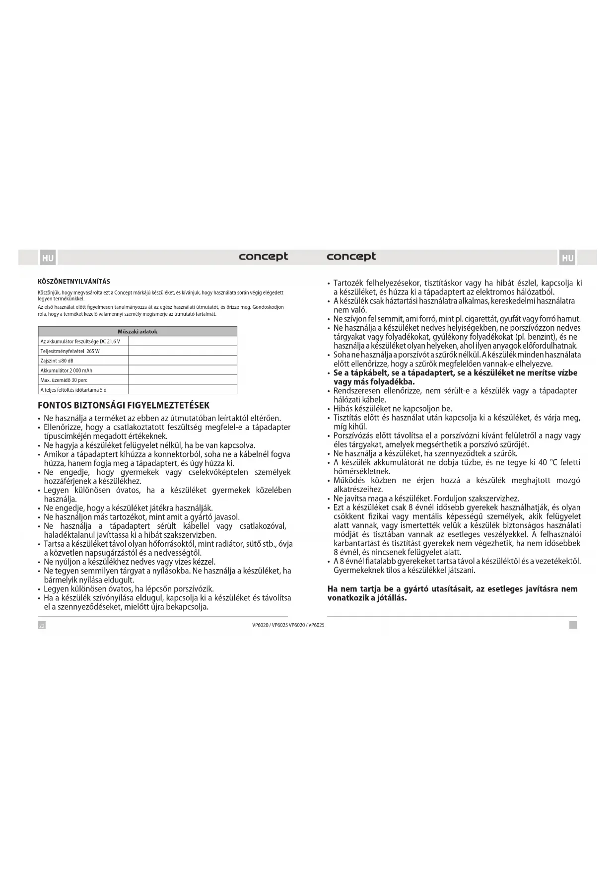 Köszönjük, hogy megvásárolta ezt a Concept márkájú készüléket, és kívánjuk, hogy használata során végig elégedett legyen termékünkkel. Az első használat előtt figyelmesen tanulmányozza át az egész használati útmutatót, és őrizze meg. Gondoskodjon róla, hogy a terméket kezelő valamennyi személy megismerje az útmutató tartalmát. Műszaki adatok Az akkumulátor feszültsége DC 21,6 V Teljesítményfelvétel 265 W Zajszint ≤80 dB Akkumulátor 2 000 mAh Max. üzemidő 30 perc A teljes feltöltés időtartama 5 ó
