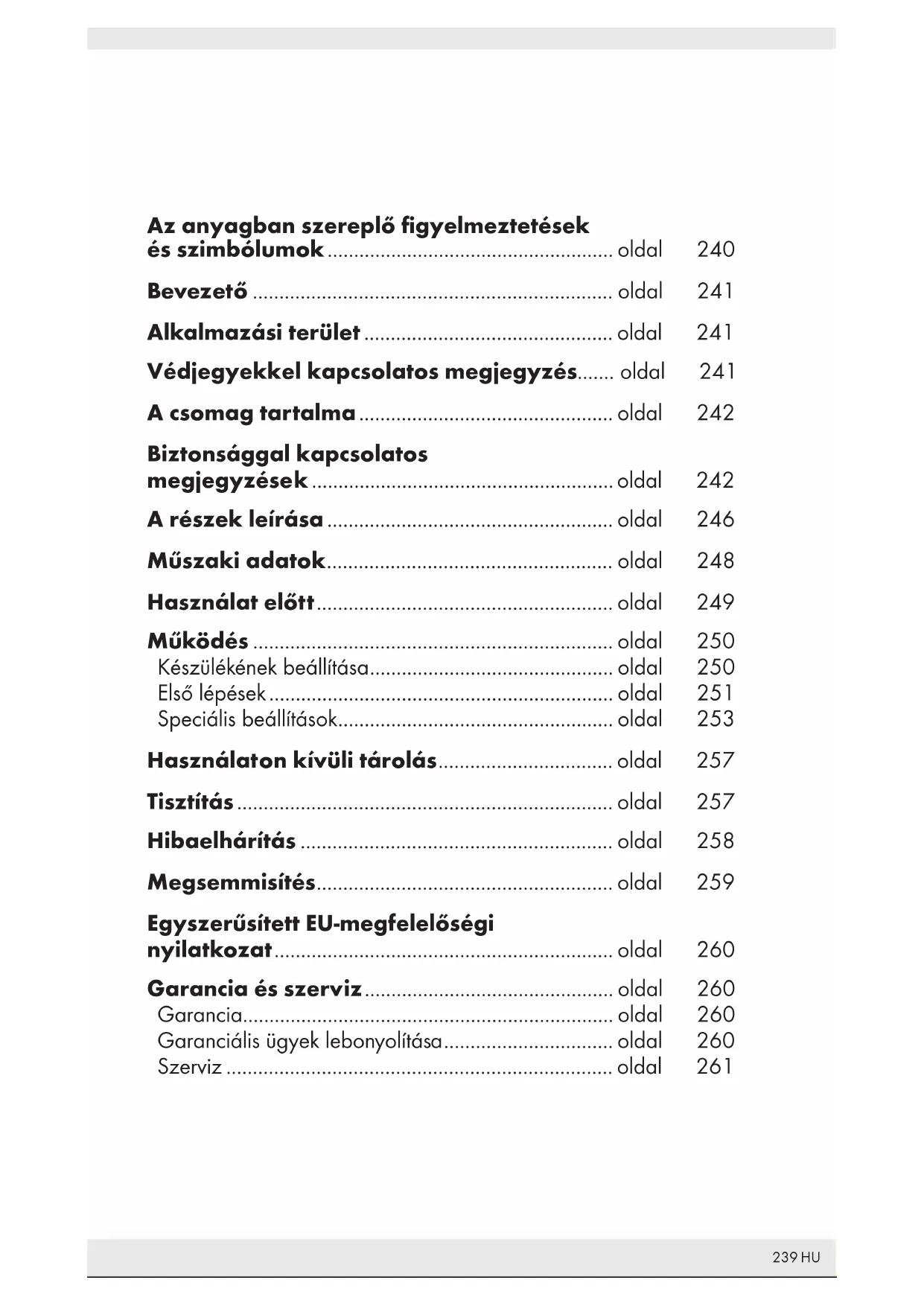Kezelési és biztonsági utalások Oldal 239