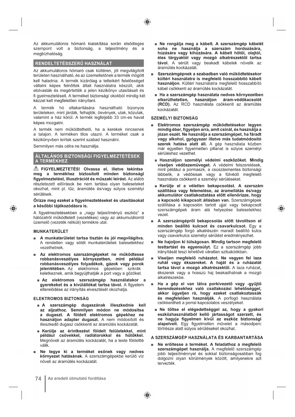 Az eredeti útmutató fordítása■ Ne használja a szerszámgépet, ha a kapcsoló nem kapcsol be és ki. Bármilyen szerszámgép veszélyes, amit a kapcsolóval nem lehet irányítani, ezért azt meg kell javítani. ■ Mielőtt beállítást végezne, tartozékot cserélne vagy a nagy teljesítményű gépet eltárolná, húzza ki a csatlakozódugót a konnektorból és/vagy vegye ki az akkumulátort, ha eltávolítható. Az ilyen megelőző biztonsági óvintézkedések csökkentik a szerszámgép véletlen bekapcsolódásának kockázatát. ■ A használaton kívüli gépet gyerekek számára nem elérhető helyen tárolja, és ne hagyja, hogy a szerszámgépet vagy a kézikönyvet nem ismerő személyek használják a szerszámgépet. Gyakorlatlan felhasználók kezében a szerszámgépek veszélyesek. ■ Végezze el a nagy teljesítményű gépek és a tartozékok karbantartását. Ellenőrizze a mozgó alkatrészek akadását vagy helytelen beállítását, az alkatrészek törését és minden más körülményt, ami hatással lehet a szerszámgép működésére. Ha sérült, a szerszámgépet használat előtt meg kell javítani. Sok balesetet a rosszul karbantartott szerszámgépek okoznak. ■ A vágószerszámok legyenek élesek és tiszták. A megfelelően karbantartott, éles vágóélű vágószerszámok kevésbé akadnak be és könnyebben irányíthatók. ■ A szerszámgépet, a tartozékokat és a biteket stb. ezen utasításban leírtaknak megfelelően használja, figyelembe véve a munkakörülményeket és az elvégzendő feladatot. A szerszámgép rendeltetéstől eltérő műveletekre való használata veszélyes helyzeteket eredményezhet. ■ A fogantyúkat és a fogófelületeket tartsa szárazon, tisztán, olajtól és kenőzsírtól mentesen. A csúszós fogantyúk és fogófelületek nem teszik lehetővé a gép kezelését és irányítását egy váratlan helyzetben. AKKUMULÁTOROS SZERSZÁMGÉP HASZNÁLATA ÉS KARBANTARTÁSA ■ Csak a gyártó által megadott töltővel töltse az akkumulátorokat. Egy adott akkumulátortípushoz való töltő egy másik típusú akkumulátorral való használata tűzveszélyes lehet. ■ A szerszámokat csak a hozzájuk való akkumulátorokkal üzemeltesse. Más akkumulátorok használata tűzveszélyes lehet, és sérüléseket okozhat. ■ Az akkumulátort használaton kívül tartsa távol más fém tárgyaktól, úgymint gemkapcsoktól, érméktől, kulcsoktól, szögektől, csavaroktól vagy más kisméretű fém tárgyaktól, amelyek rövidre zárhatják a két érintkezőt. Az akkumulátor érintkezőinek rövidre zárása tüzet vagy égéseket okozhat. ■ Nem megfelelő körülmények esetén folyadék távozhat az akkumulátorból, kerülje az azzal való érintkezést. Ha mégis érintkezik vele, öblítse le vízzel. Ha a folyadék szembe kerül, forduljon orvoshoz. Az akkumulátorból kifolyt folyadék irritációt vagy égéseket okozhat. ■ Ne használjon sérült vagy átalakított akkucsomagot vagy eszközt. A sérült vagy átalakított akkumulátor előre nem látható módon üzemelhet, ami tüzet, robbanást, más kockázatot vagy sérülést okozhat. ■ Ne tegye ki az akkucsomagot vagy az eszközt túl magas hőmérsékleti hatásnak és ne tegye tűzbe ezeket. A tűznek vagy a 130°C feletti hőmérsékletnek való kitettség robbanást okozhat. ■ Tartsa be az összes feltöltési utasítást és ne töltse az akkucsomagot vagy az eszközt az utasításban megadott hőmérséklet-tartományon kívül. A helytelen töltés vagy a megadott tartományon kívüli hőmérsékleten való feltöltés az akkumulátort károsíthatja, és a tűzveszély kockázatát növelheti. KARBANTARTÁS ■ A szerszámgépet csak szakképzett szervizszakemberrel szervizeltesse, csak azonos cserealkatrészeket használva. Ez biztosítja, hogy a szerszámgép használata továbbra is biztonságos legyen. ■ Soha ne javítson sérült akkucsomagokat. Az akkucsomagok javítását csak a gyártó vagy a hivatalos szervizek végezhetik.