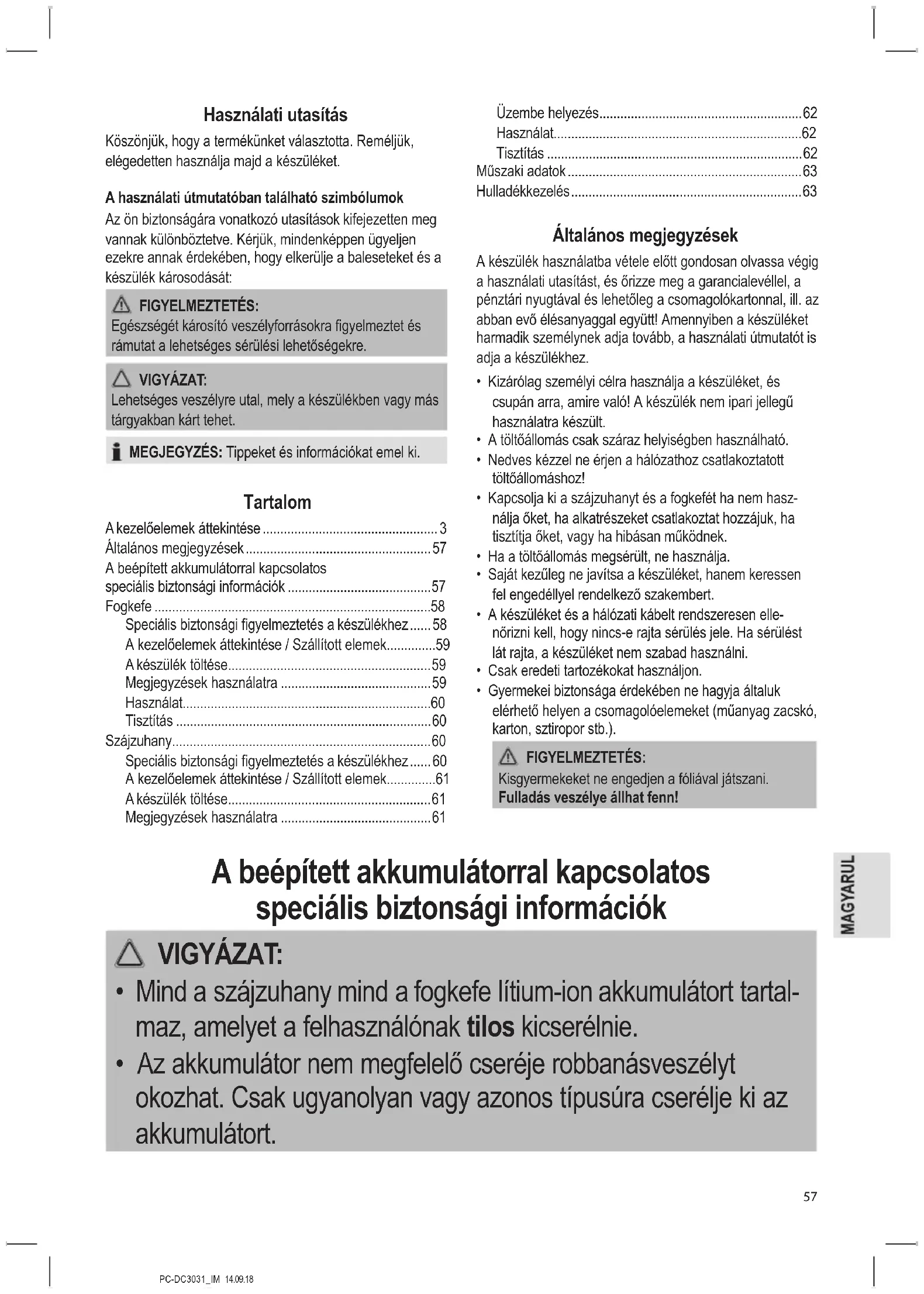- A beépített akkumulátorral kapcsolatos speciális biztonsági információk p. 57