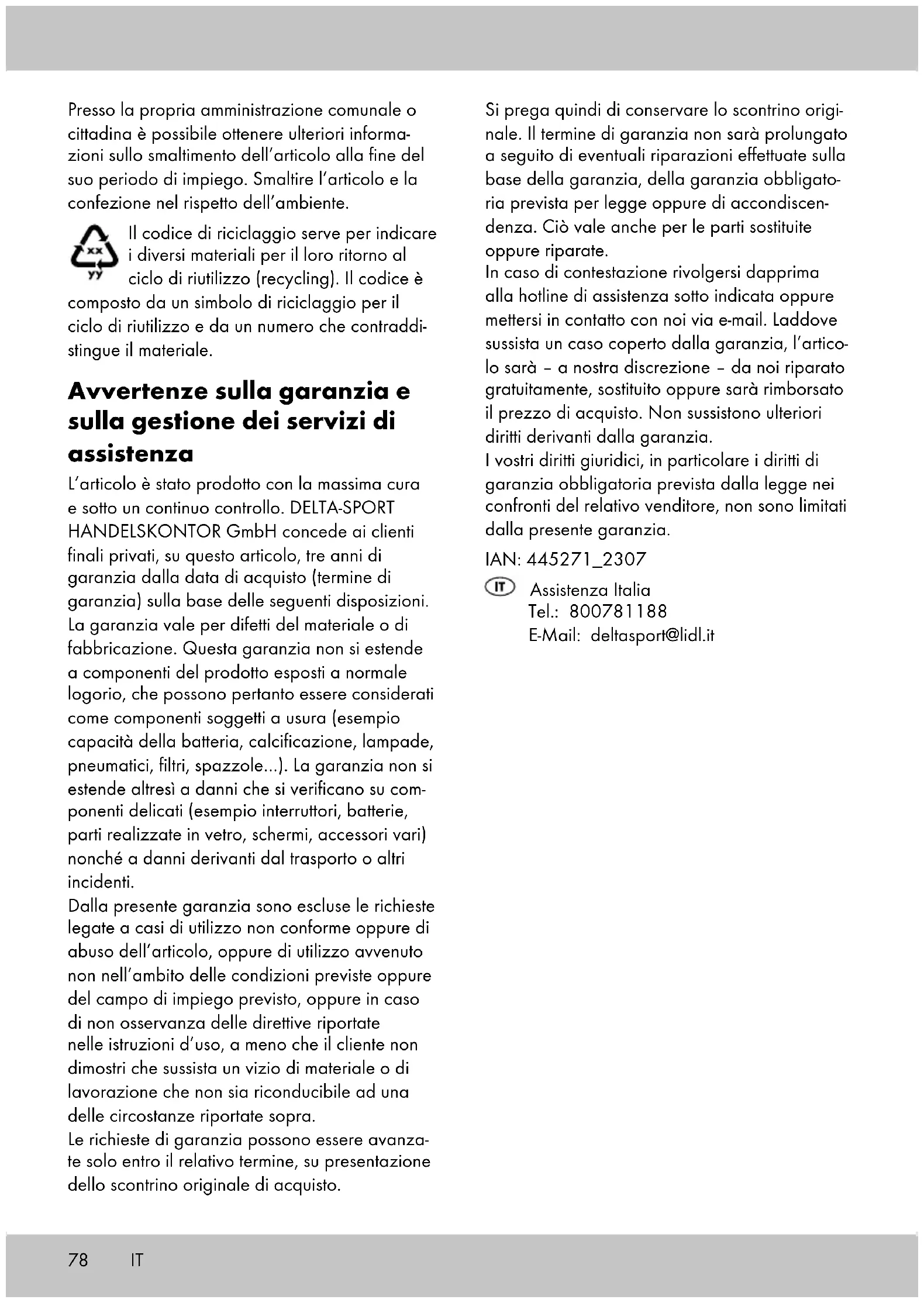 újra felpumpálja a kajakot. Tudnivalók a hulladékkeze- lésről A terméket és a csomagolóanyagokat a hatályos helyi előírásoknak megfelelően semmisítse meg. A csomagolóanyagokat (például fóliatasakokat) tartsa távol a gyermekektől. Az elhasználódott termék ártalmatlanításával kapcsolatos további információkat a települési vagy városi önkor- mányzattól tudhatja meg. A terméket és a csomagolást környezetkímélő módon kell ártalmatlanítani. Az újrahasznosítási kód az újrafelhasz- nálási ciklusba való visszavezetésre (újrahasznosítás) szánt különböző anyagok azonosítására szolgál. A kód az újrahasznosítási ciklus újrahasznosítási szimbólu- mából és az anyagot azonosító számból áll. A garanciával és a szerviz lebonyolításával kapcsolatos útmutató A termék nagy gondossággal és állandó ellenőr- zés mellett készült. A DELTA-SPORT HANDELS- KONTOR GmbH privát végső felhasználóknak a vásárlás dátumától számított három év (garancia időtartama) garanciát ad erre a termékre a kö- vetkező rendelkezések szerint. A garancia csak anyaghibára és feldolgozási hibára érvényes. A garancia nem terjed ki a szokásos elhasználó- dásnak kitett, ezért kopó alkatrésznek tekintendő alkatrészekre (pl. elemek), valamint a törékeny alkatrészekre sem, például a kapcsolókra, az akkumulátorokra vagy az üvegből készült alkatrészekre. Kizárásra kerül a garanciaigény, ha a terméket szakszerűtlenül vagy helytelenül, nem rendel- tetésszerűen vagy nem az előirányzott felhasz- nálási körben használták, vagy figyelmen kívül hagyták a kezelési útmutató előírásait, kivéve, ha a végső felhasználó bizonyítja, hogy olyan anyag- vagy feldolgozási hiba áll fenn, amely nem a fent említett körülmények valamelyikéből ered. A garanciaigény csak a garancia időtartamán belül, az eredeti pénztári bizonylat bemutatásá- val érvényesíthető. Ezért kérjük, őrizze meg az eredeti pénztári bizonylatot. A garancia, a tör- vényes garancia vagy a méltányosság alapján végzett esetleges javítások a garancia időtar- tamát nem hosszabbítják meg. Ez vonatkozik a kicserélt és javított alkatrészekre is. Kérjük, hogy reklamáció esetén először az aláb- bi szervizvonalat hívja, vagy e-mailen keressen minket. Garanciális esetekben a terméket saját döntésünk alapján ingyenesen megjavítjuk, kicseréljük vagy megtérítjük a vételárat. HU85 A garanciából további jogok nem következnek. A jelen garancia nem korlátozza az Ön törvé- nyes jogait, különösen a mindenkori értékesítővel szembeni garanciaigényét. IAN: 445271_2307 Szerviz Magyarország Tel.: 06800 21225 E-Mail: deltasport@lidl.hu HU868788