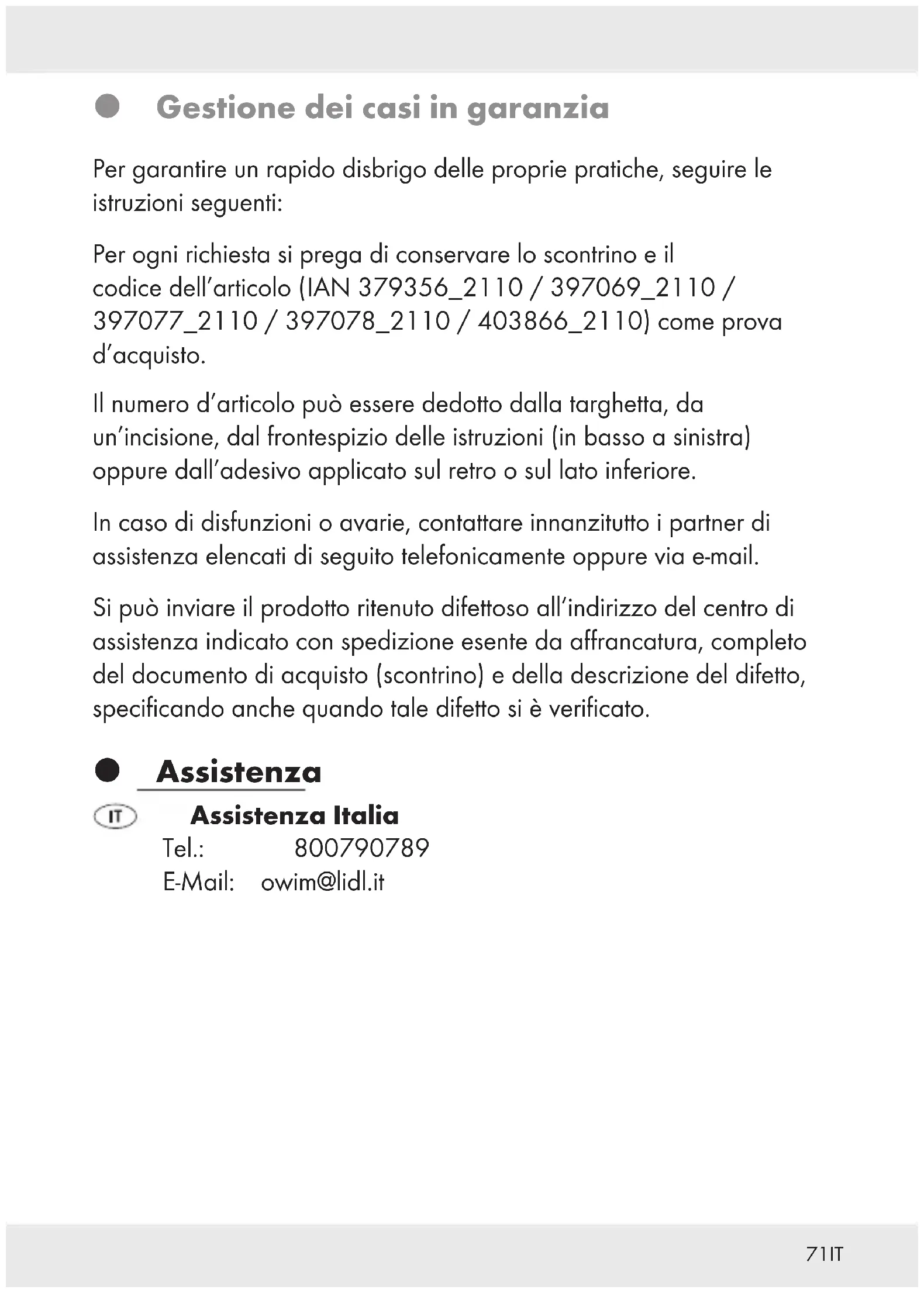 VIGYÁZAT! Vegye figyelembe, hogy a zománc esés vagy egy erősebb ütés következtében megsérülhet. Mentesítés A csomagolás környezetbarát anyagokból készült, amelyeket a helyi újrahasznosító helyeken adhat le ártalmatlanítás céljából. A kiszolgált termék megsemmisítési lehetőségeiről lakóhelye illetékes önkormányzatánál tájékozódhat. Garancia A terméket szigorú minőségi előírások betartásával gondosan gyártottuk, és szállítás előtt lelkiismeretesen ellenőriztük. Ha a terméken hiányosságot tapasztal, akkor a termék eladójával szemben törvényes jogok illetik meg Önt. Ezeket a törvényes jogokat a következőkben ismertetett garancia vállalásunk nem korlátozza. A termékre 3 év garanciát adunk a vásárlás dátumától számítva. A garanciális idő a vásárlás dátumával kezdődik. Kérjük, jól őrizze meg a pénztári blokkot. Ez a bizonylat szükséges a vásárlás tényének az igazolásához.77HU Ha a termék vásárlásától számított 3 éven belül anyag- vagy gyártási hiba merül fel, akkor a választásunk szerint a terméket ingyen megjavítjuk vagy kicseréljük. A garancia megszűnik, ha a terméket megrongálták, nem szakszerűen kezelték vagy tartották karban. A garancia az anyag- vagy gyártáshibákra vonatkozik. A garancia nem terjed ki azokra a termékrészekre, melyek normál kopásnak vannak kitéve és ezért fogyóeszköznek tekinthetők (pl. elemek), vagy a törékeny részekre sérülésére, pl. kapcsolók, akkuk, vagy üvegből készült részek. Garanciális ügyek lebonyolítása Ügyének gyors elintézhetősége céljából, kérjük kövesse az alábbi útmutatást: Kérjük, kérdések esetére készítse elő a pénztárblokkot és a cikkszámot (IAN 379356_2110 / 397069_2110 / 397077_2110 / 397078_2110 / 403866_2110) a vásárlás tényének az igazolására. Kéjük, hogy a cikkszámot olvassa le a típustábláról, a gravírozásból, az Útmutató címoldaláról (balra lent), illetve a hátoldalon, vagy a termék alján található matricáról. Amennyiben működési hibák, vagy egyéb hiányosság lépne fel, előszöris vegye fel a kapcsolatot a következőkben megnevezett szervizek egyikével telefonon, vagy e-mailen. A hibásnak ítélt terméket ezután a vásárlást igazoló blokk, valamint a hiba leírásának és keletkezési idejének mellékelésével díjmentesen postázhatja az Önnel közölt szervizcímre. Szerviz Szerviz Magyarország Tel.: 0680021536 E-mail: owim@lidl.hu78 SI