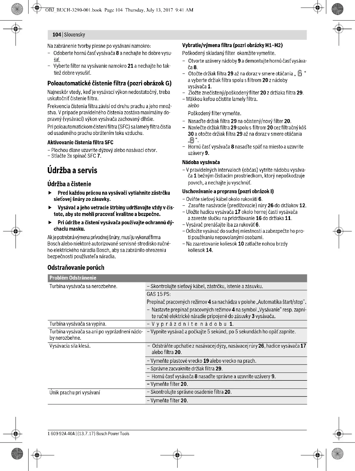 – Hornú časť vysávača 8 nasaďte späť na miesto a uzavrite uzávery 9. Nádoba vysávača – V pravidelných intervaloch (občas) vytrite nádobu vysáva- ča 1 bežným čistiacim prostriedkom, ktorý nepoškodzuje povrch, a nechajte ju vyschnúť. Uschovávanie a preprava (pozri obrázok I) – Oviňte sieťový kábel okolo rukoväti 6. – Zasuňte nasávacie (predlžovacie) rúry 26 do držiakov 12. – Uložte hadicu vysávača 17 okolo hornej časti vysávača a zaveste slučku na pridržiavanie 16 do držiaka 11. – Vysávač prenášajte iba za rukoväť 6. – Odložte vysávač do suchej miestnosti a zabezpečte ho pro- ti používaniu nepovolanými osobami. – Na zaaretovanie koliesok 10 zatlačte nohou brzdy koliesok 14. Odstraňovanie porúch Problém Odstránenie Turbína vysávača sa nerozbehne. – Skontrolujte sieťový kábel, zástrčku, istenie a zásuvku. GAS 15 PS: Prepínač pracovných režimov 4 sa nachádza v polohe „Automatika štart/stop“. – Nastavte prepínač pracovných režimov 4 na symbol „Vysávanie“ resp. zapni- te ručné elektrické náradie pripojené do zásuvky 3 vysávača. Turbína vysávača sa vypína. –Vyprázdnite nádobu 1. Turbína vysávača sa ani po vyprázdnení nádo- by nerozbehne. – Vypnite vysávač a počkajte 5 sekúnd, po 5 sekundách ho opäť zapnite. Vysávacia sila klesá. – Odstráňte upchatie z nasávacej dýzy, nasávacej rúry 26, hadice vysávača 17 alebo filtra 20. – Vymeňte plastové vrecko 19 alebo vrecko na prach. – Správne zacvaknite držiak filtra 29. – Hornú časť vysávača 8 nasaďte správne a uzavrite uzávery 9. – Vymeňte filter 20. Únik prachu pri vysávaní – Skontrolujte správne osadenie filtra 20. – Vymeňte filter 20. OBJ_BUCH-3290-001.book Page 104 Thursday, July 13, 2017 9:41 AMMagyar | 105Bosch Power Tools 1 609 92A 40A | (13.7.17) Servisné stredisko a poradenstvo pri používaní Servisné stredisko Vám odpovie na otázky týkajúce sa opravy a údržby Vášho produktu ako aj náhradných súčiastok. Rozlo-žené obrázky a informácie k náhradným súčiastkam nájdete aj na web-stránke:www.bosch-pt.comTím poradcov Bosch Vám s radosťou poskytne pomoc pri otázkach týkajúcich sa našich produktov a ich príslušenstva.V prípade akýchkoľvek otázok a objednávok náhradných sú-čiastok uvádzajte bezpodmienečne 10-miestne vecné číslo uvedené na typovom štítku výrobku.SlovakiaNa www.bosch-pt.sk si môžete objednať opravu vášho stroja alebo náhradné diely online.Tel.: +421 2 48 703 800Fax: +421 2 48 703 801E-Mail: servis.naradia@sk.bosch.comwww.bosch-pt.sk Likvidácia Vysávač, príslušenstvo a obaly treba dať na recykláciu zodpo-vedajúcu ochrane životného prostredia.Neodhadzujte vysávač do komunálneho odpadu!Zmeny vyhradené. Magyar Biztonsági előírások Olvassa el az összes biztonsági figyelmezte- tést és előírást. Akövetkezőkben leírt előírások betartásának elmulasztása áramütésekhez, tűz- höz és/vagy súlyos testi sérülésekhez vezethet.Kérjük ezt a biztonsági útmutatót gondosan őrizze meg. Ez a porszívó nincs arra előirányoz- va, hogy gyerekek és korlátozott fi- zikai, érzékelési vagy szellemi ké- pességű, illetve kellő tapasztalat- tal és/vagy tudással nem rendelke- ző személyek használják. Ellenkező esetben fennáll a hibás működés és a sérülés veszélye. Ne hagyja felügyelet nélkül a gyer- mekeket. Ez biztosítja, hogy gyere- kek ne játsszanak a porszívóval. Ne szívjon fel az egészségre áralmas anyagokat, például bükkfa- vagy tölgyfaport, kőport, vagy azbesztet. Ezek az anyagok rákkeltő hatásúak.Tájékozódjon az egészségre ártalmas porok kezelésére vonatkozó törvényes előírásokról/törvényekről, amelyek az Ön országában érvényben vannak.A porszívót csak akkor hasz-nálja, ha elegendő informá-ciót kapott a használatához. Egy gondos betanítás csökken- ti a hibás kezelési lépések és a sérülések lehetőségét. Az elszívó berendezés szá-raz anyagok, és megfelelő intézkedések mellett folyadékok felszívására is alkalmas. A folyadékok behatolása a berendezés belsejébe megnöveli az áramütés veszélyét. Ne szívjon fel a porelszívóval gyúlékony vagy robbané-kony folyadékokat, például benzint, olajat, alkoholt és oldószereket. Ne szívjon fel forró vagy égő porokat. Ne használja a porelszívót robbanásveszélyes helyiségek- ben. A porok, gőzök vagy folyadékok meggyulladhatnak vagy felrobbanhatnak.A dugaszolóaljzatot csak az ezen Üzemeltetési útmuta-tóban megadott célokra szabad használni.Ha hab vagy víz lép ki, azon-nal kapcsolja ki a porelszí- vót és ürítse ki a tartályt. A porelszívó ellenkező esetben megrongálódhat.Tartsa távol az elszívó berendezést az esőtől vagy nedvességtől. Ha víz hatol be az elszívó berendezés felső részébe, ez megnöveli az áram- ütés veszélyét.Az elszívó berendezést csak belső he-lyiségekben szabad tárolni. Rendszeresen tisztítsa meg az úszó-testet, és ellenőrizze, nincs-e megron- gálódva. Ellenkező esetben ez a funkció hibásan működhet. Ha nem lehet elkerülni a porelszívó nedves környezet-ben való használatát, alkalmazzon egy hibaáram-véd- kapcsolót. Egy hibaáram-védőkapcsoló alkalmazása csök- kenti az áramütés kockázatát.Vypínacia automatika (vysávanie namokro) sa neiniciuje.Pri kvapalinách, ktoré nie sú elektricky vodivé alebo ak sa tvorí pena, vypínacia automatika nefunguje.– Prekontrolujte stav naplnenia nádoby. Čistenie filtra nepracuje. – Stlačte spínač SFC 7. Problém Odstránenie FIGYELMEZTETÉS FIGYELMEZTETÉS FIGYELMEZTETÉS FIGYELMEZTETÉS FIGYELMEZTETÉS OBJ_BUCH-3290-001.book Page 105 Thursday, July 13, 2017 9:41 AM106 | Magyar 1 609 92A 40A | (13.7.17) Bosch Power Tools Csatlakoztassa a porelszívót egy előírásszerűen