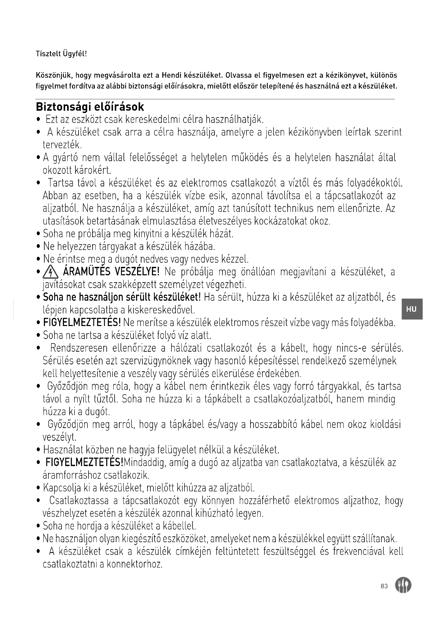 Tisztelt Ügyfél! Köszönjük, hogy megvásárolta ezt a Hendi készüléket. Olvassa el figyelmesen ezt a kézikönyvet, különös figyelmet fordítva az alábbi biztonsági előírásokra, mielőtt először telepítené és használná ezt a készüléket. Biztonsági előírások