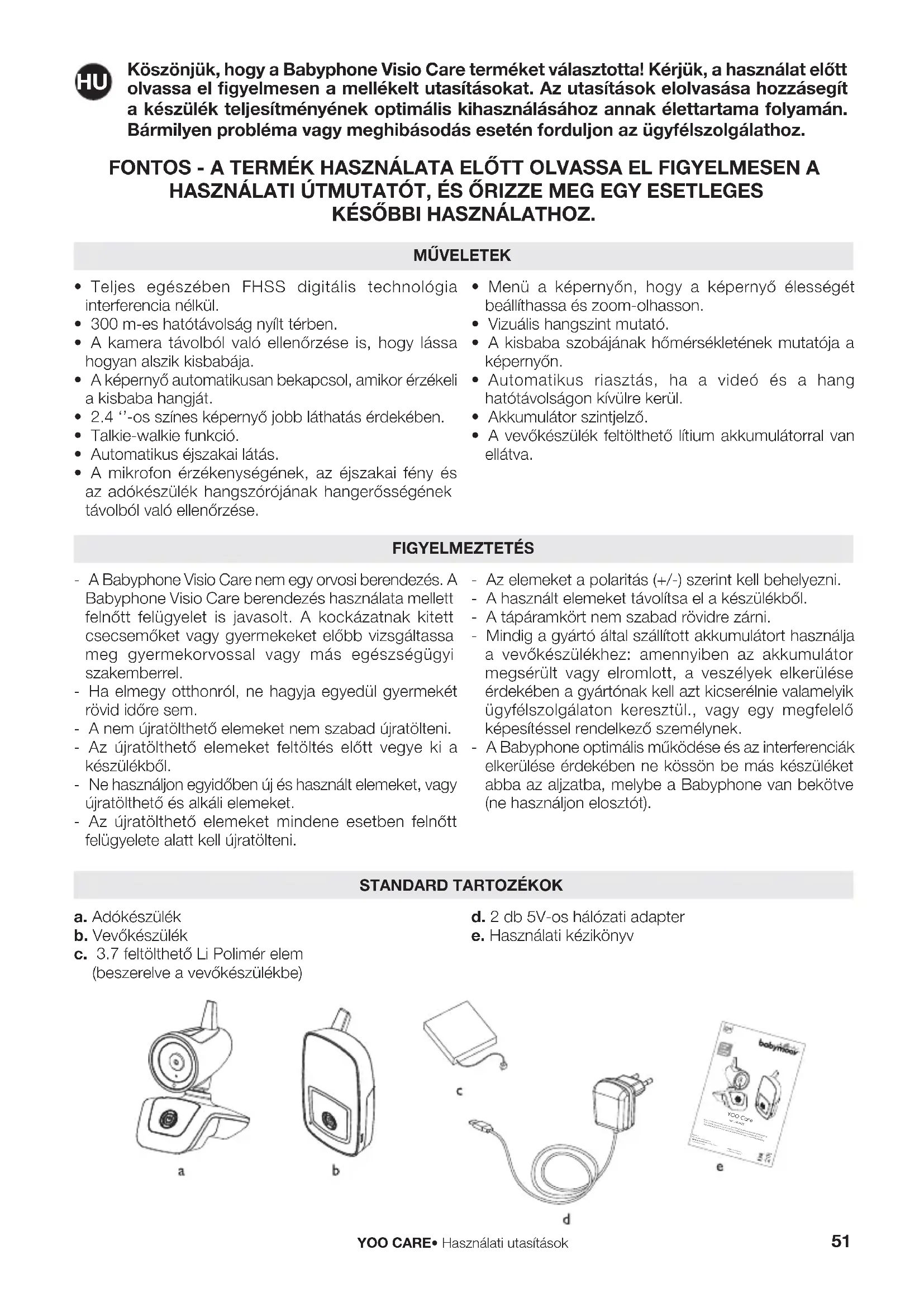 Köszönjük, hogy a Babyphone Visio Care terméket választotta! Kérjük, a használat előtt olvassa el figyelmesen a mellékelt utasításokat. Az utasítások elolvasása hozzásegít a készülék teljesítményének optimális kihasználásához annak élettartama folyamán. Bármilyen probléma vagy meghibásodás esetén forduljon az ügyfélszolgálathoz. FONTOS - A TERMÉK HASZNÁLATA ELŐTT OLVASSA EL FIGYELMESEN A HASZNÁLATI ÚTMUTATÓT, ÉS ŐRIZZE MEG EGY ESETLEGES KÉSŐBBI HASZNÁLATHOZ. MŰVELETEK