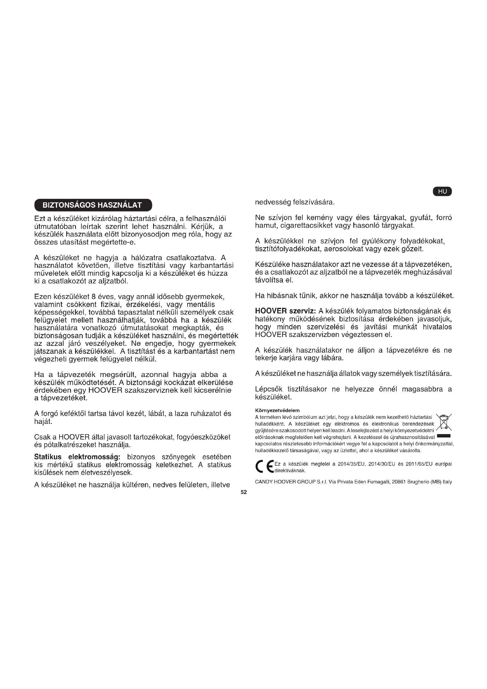 Ezt a készüléket kizárólag háztartási célra, a felhasználói útmutatóban leírtak szerint lehet használni. Kérjük, a készülék használata előtt bizonyosodjon meg róla, hogy az összes utasítást megértette-e. A készüléket ne hagyja a hálózatra csatlakoztatva. A használatot követően, illetve tisztítási vagy karbantartási műveletek előtt mindig kapcsolja ki a készüléket és húzza ki a csatlakozót az aljzatból. Ezen készüléket 8 éves, vagy annál idősebb gyermekek, valamint csökkent zikai, érzékelési, vagy mentális képességekkel, továbbá tapasztalat nélküli személyek csak felügyelet mellett használhatják, továbbá ha a készülék használatára vonatkozó útmutatásokat megkapták, és biztonságosan tudják a készüléket használni, és megértették az azzal járó veszélyeket. Ne engedje, hogy gyermekek játszanak a készülékkel. A tisztítást és a karbantartást nem végezheti gyermek felügyelet nélkül. Ha a tápvezeték megsérült, azonnal hagyja abba a készülék működtetését. A biztonsági kockázat elkerülése érdekében egy HOOVER szakszerviznek kell kicserélnie a tápvezetéket. A forgó keféktől tartsa távol kezét, lábát, a laza ruházatot és haját. Csak a HOOVER által javasolt tartozékokat, fogyóeszközöket és pótalkatrészeket használja. Statikus elektromosság: bizonyos szőnyegek esetében kis mértékű statikus elektromosság keletkezhet. A statikus kisülések nem életveszélyesek. A készüléket ne használja kültéren, nedves felületen, illetve nedvesség felszívására. Ne szívjon fel kemény vagy éles tárgyakat, gyufát, forró hamut, cigarettacsikket vagy hasonló tárgyakat. A készülékkel ne szívjon fel gyúlékony folyadékokat, tisztítófolyadékokat, aerosolokat vagy ezek gőzeit. Készüléke használatakor azt ne vezesse át a tápvezetéken, és a csatlakozót az aljzatból ne a tápvezeték meghúzásával távolítsa el. Ha hibásnak tűnik, akkor ne használja tovább a készüléket. HOOVER szerviz: A készülék folyamatos biztonságának és hatékony működésének biztosítása érdekében javasoljuk, hogy minden szervizelési és javítási munkát hivatalos HOOVER szakszervizben végeztessen el. A készülék használatakor ne álljon a tápvezetékre és ne tekerje karjára vagy lábára. A készüléket ne használja állatok vagy személyek tisztítására. Lépcsők tisztításakor ne helyezze önnél magasabbra a készüléket. Környezetvédelem A terméken lévő szimbólum azt jelzi, hogy a készülék nem kezelhető háztartási hulladékként. A készüléket egy elektromos és elektronikus berendezések gyűjtésére szakosodott helyen kell leadni. A leselejtezést a helyi környezetvédelmi előírásoknak megfelelően kell végrehajtani. A kezeléssel és újrahasznosításával kapcsolatos részletesebb információkért vegye fel a kapcsolatot a helyi önkormányzattal, hulladékkezelő társaságával, vagy az üzlettel, ahol a készüléket vásárolta. Ez a készülék megfelel a 2014/35/EU, 2014/30/EU és 2011/65/EU európai direktíváknak. CANDY HOOVER GROUP S.r.l. Via Privata Eden Fumagalli, 20861 Brugherio (MB) Italy HU53 *Csak bizonyos modellek esetén **A szívófej kialakítása típusfüggő.
