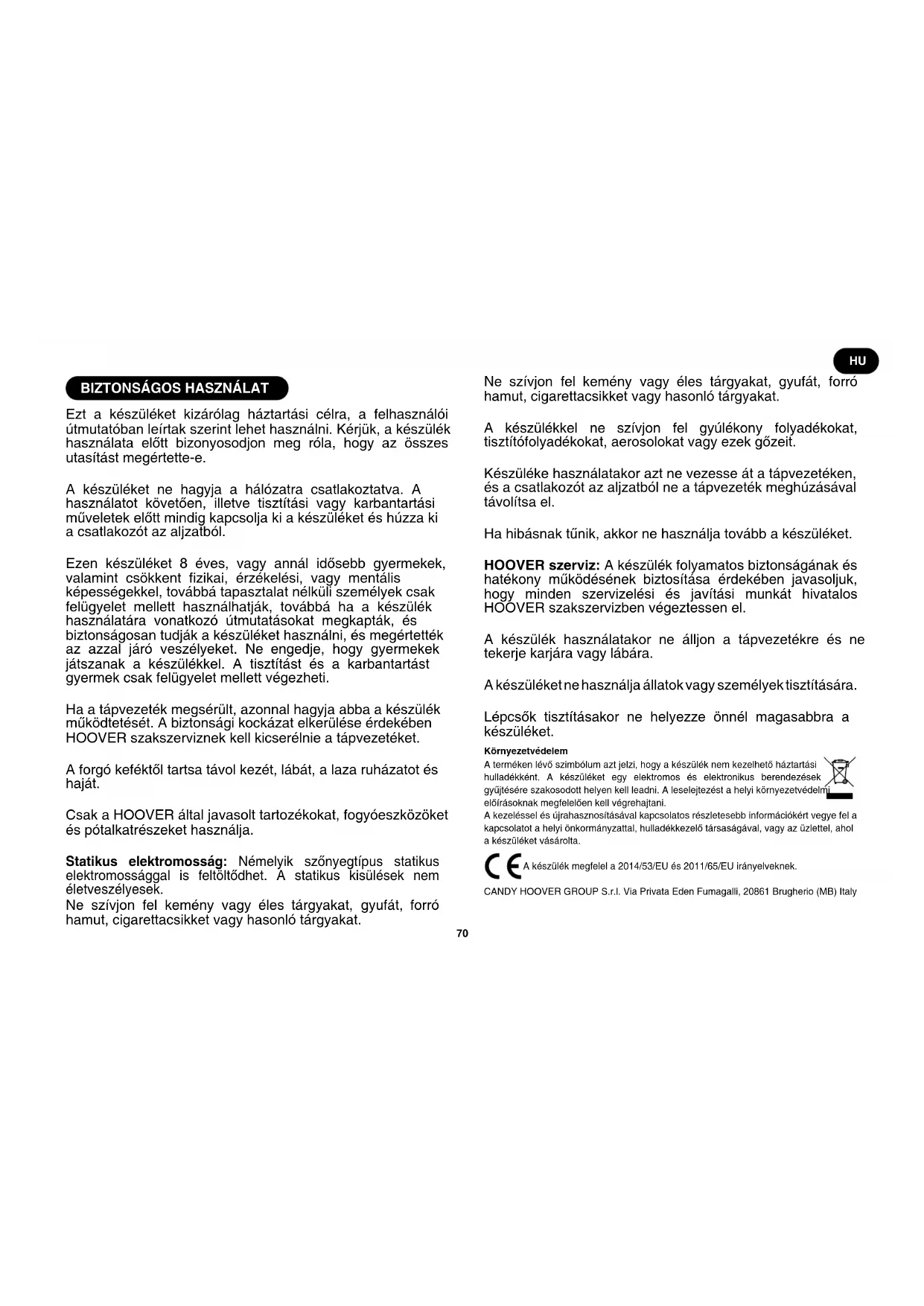 Ezt a készüléket kizárólag háztartási célra, a felhasználói útmutatóban leírtak szerint lehet használni. Kérjük, a készülék használata előtt bizonyosodjon meg róla, hogy az összes utasítást megértette-e. A készüléket ne hagyja a hálózatra csatlakoztatva. A használatot követően, illetve tisztítási vagy karbantartási műveletek előtt mindig kapcsolja ki a készüléket és húzza ki a csatlakozót az aljzatból. Ezen készüléket 8 éves, vagy annál idősebb gyermekek, valamint csökkent zikai, érzékelési, vagy mentális képességekkel, továbbá tapasztalat nélküli személyek csak felügyelet mellett használhatják, továbbá ha a készülék használatára vonatkozó útmutatásokat megkapták, és biztonságosan tudják a készüléket használni, és megértették az azzal járó veszélyeket. Ne engedje, hogy gyermekek játszanak a készülékkel. A tisztítást és a karbantartást gyermek csak felügyelet mellett végezheti. Ha a tápvezeték megsérült, azonnal hagyja abba a készülék működtetését. A biztonsági kockázat elkerülése érdekében HOOVER szakszerviznek kell kicserélnie a tápvezetéket. A forgó keféktől tartsa távol kezét, lábát, a laza ruházatot és haját. Csak a HOOVER által javasolt tartozékokat, fogyóeszközöket és pótalkatrészeket használja. Statikus elektromosság: Némelyik szőnyegtípus statikus elektromossággal is feltöltődhet. A statikus kisülések nem életveszélyesek. Ne szívjon fel kemény vagy éles tárgyakat, gyufát, forró hamut, cigarettacsikket vagy hasonló tárgyakat. Ne szívjon fel kemény vagy éles tárgyakat, gyufát, forró hamut, cigarettacsikket vagy hasonló tárgyakat. A készülékkel ne szívjon fel gyúlékony folyadékokat, tisztítófolyadékokat, aerosolokat vagy ezek gőzeit. Készüléke használatakor azt ne vezesse át a tápvezetéken, és a csatlakozót az aljzatból ne a tápvezeték meghúzásával távolítsa el. Ha hibásnak tűnik, akkor ne használja tovább a készüléket. HOOVER szerviz: A készülék folyamatos biztonságának és hatékony működésének biztosítása érdekében javasoljuk, hogy minden szervizelési és javítási munkát hivatalos HOOVER szakszervizben végeztessen el. A készülék használatakor ne álljon a tápvezetékre és ne tekerje karjára vagy lábára. A készüléket ne használja állatok vagy személyek tisztítására. Lépcsők tisztításakor ne helyezze önnél magasabbra a készüléket. Környezetvédelem A terméken lévő szimbólum azt jelzi, hogy a készülék nem kezelhető háztartási hulladékként. A készüléket egy elektromos és elektronikus berendezések gyűjtésére szakosodott helyen kell leadni. A leselejtezést a helyi környezetvédelmi előírásoknak megfelelően kell végrehajtani. A kezeléssel és újrahasznosításával kapcsolatos részletesebb információkért vegye fel a kapcsolatot a helyi önkormányzattal, hulladékkezelő társaságával, vagy az üzlettel, ahol a készüléket vásárolta. A készülék megfelel a 2014/53/EU és 2011/65/EU irányelveknek. CANDY HOOVER GROUP S.r.l. Via Privata Eden Fumagalli, 20861 Brugherio (MB) Italy HU71