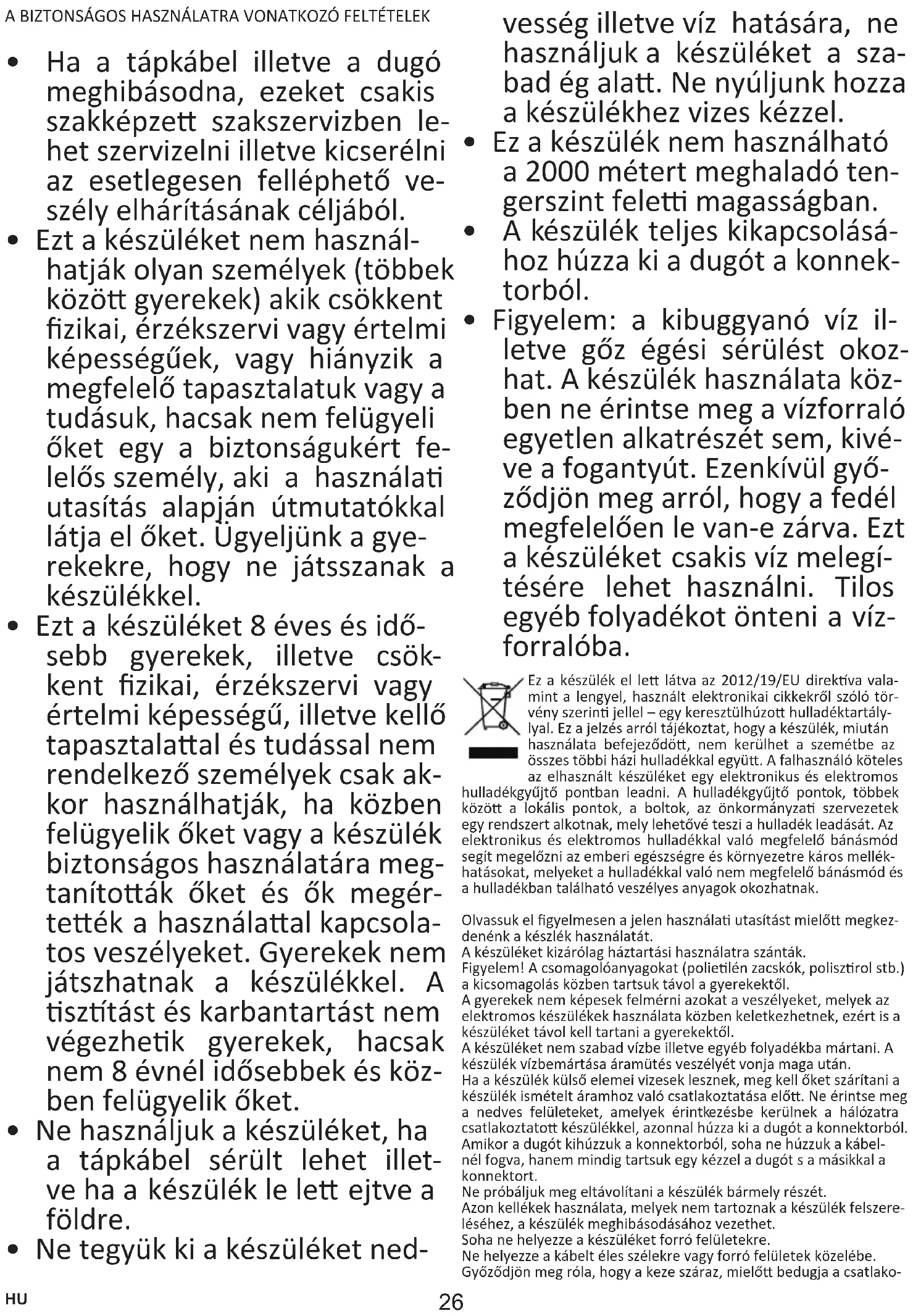- Figyelem: a kibuggyanó víz il- letve gőz égési sérülést okoz- hat. A készülék használata köz- ben ne érintse meg a vízforraló egyetlen alkatrészét sem, kivé- ve a fogantyút. Ezenkívül győ- ződjön meg arról, hogy a fedél megfelelően le vane zárva. Ezt a készüléket csakis víz melegí- tésére lehet használni. Tilos egyéb folyadékot önteni a víz- forralóba. Ez a készülék el le látva az 2012/19/EU direkva vala- mint a lengyel, használt elektronikai cikkekről szóló tör- vény szerin jellel – egy keresztülhúzo hulladéktartály- lyal. Ez a jelzés arról tájékoztat, hogy a készülék, miután használata befejeződö, nem kerülhet a szemétbe az összes többi házi hulladékkal együ. A falhasználó köteles az elhasznált készüléket egy elektronikus és elektromos hulladékgyűjtő pontban leadni. A hulladékgyűjtő pontok, többek közö a lokális pontok, a boltok, az önkormányza szervezetek egy rendszert alkotnak, mely lehetővé teszi a hulladék leadását. Az elektronikus és elektromos hulladékkal való megfelelő bánásmód segít megelőzni az emberi egészségre és környezetre káros mellék- hatásokat, melyeket a hulladékkal való nem megfelelő bánásmód és a hulladékban található veszélyes anyagok okozhatnak. Olvassuk el gyelmesen a jelen használa utasítást mielő megkez- denénk a készlék használatát. A készüléket kizárólag háztartási használatra szánták. Figyelem! A csomagolóanyagokat (polielén zacskók, poliszrol stb.) a kicsomagolás közben tartsuk távol a gyerekektől. A gyerekek nem képesek felmérni azokat a veszélyeket, melyek az elektromos készülékek használata közben keletkezhetnek, ezért is a készüléket távol kell tartani a gyerekektől. A készüléket nem szabad vízbe illetve egyéb folyadékba mártani. A készülék vízbemártása áramütés veszélyét vonja maga után. Ha a készülék külső elemei vizesek lesznek, meg kell őket szárítani a készülék ismételt áramhoz való csatlakoztatása elő. Ne érintse meg a nedves felületeket, amelyek érintkezésbe kerülnek a hálózatra csatlakoztato készülékkel, azonnal húzza ki a dugót a konnektorból. Amikor a dugót kihúzzuk a konnektorból, soha ne húzzuk a kábel- nél fogva, hanem mindig tartsuk egy kézzel a dugót s a másikkal a konnektort. Ne próbáljuk meg eltávolítani a készülék bármely részét. Azon kellékek használata, melyek nem tartoznak a készülék felszere- léséhez, a készülék meghibásodásához vezethet. Soha ne helyezze a készüléket forró felületekre. Ne helyezze a kábelt éles szélekre vagy forró felületek közelébe. Győződjön meg róla, hogy a keze száraz, mielő bedugja a csatlako-27
