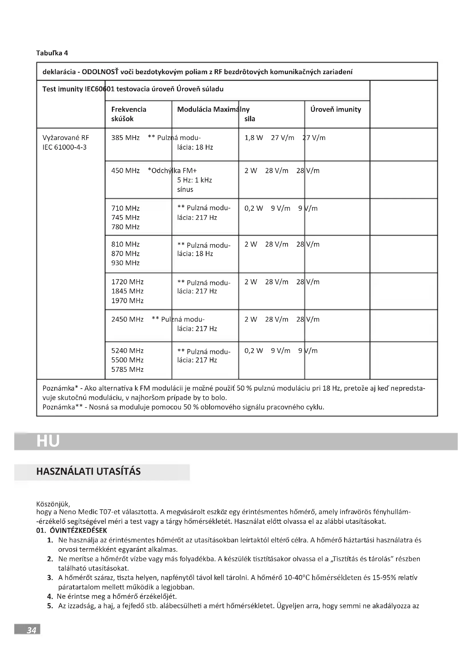 Kedvesvásárlónk,köszönjük,hogymegvásároltaNenoMedicT07hőmérőnket.Habármilyenproblémájavanakészülék normálkörülményekközöműködtetésével,forduljonegyhivatalosNenomárkájúszervizközponthozvagyforgalmazóhoz. Javításeseténőrizzemegjótállásijegyét. Atermékre24hónapgaranciavonatkozik.Ajótállásifeltételekakövetkezőcímentalálhatók:hps://neno.pl/gwarancja Arészletek,azelérhetőségésaszervizcímakövetkezőcímentalálható:hps://neno.pl/kontakt Aműszakiadatokésakészlettartalmaelőzetesértesítésnélkülváltozhat.Elnézéstkérünkazesetlegeskellemetlenségekért. AKGKTrendkijelen,hogyaNenoMedicT07készülékmegfelela2014/53/EUirányelvalapvetőkövetelményeinek.Anyilat- kozatteljesszövegeakövetkezőlinkentalálható:hps://neno.pl/download/DOC/deklaracja-CE-Neno-Medic-T07.pdf