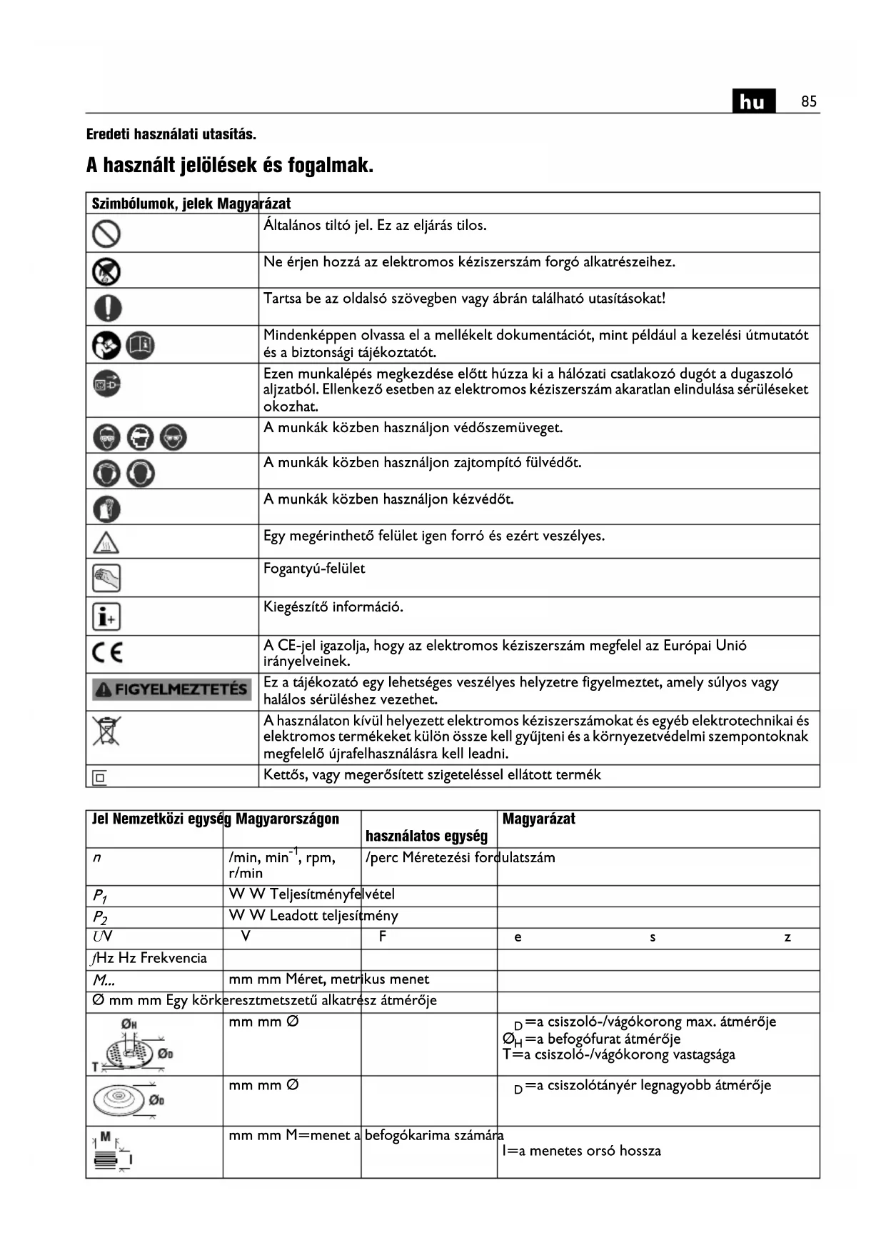 Eredeti használati utasítás. A használt jelölések és fogalmak. Szimbólumok, jelek Magyarázat Általános tiltó jel. Ez az eljárás tilos. Ne érjen hozzá az elektromos kéziszerszám forgó alkatrészeihez. Tartsa be az oldalsó szövegben vagy ábrán található utasításokat! Mindenképpen olvassa el a mellékelt dokumentációt, mint például a kezelési útmutatót és a biztonsági tájékoztatót. Ezen munkalépés megkezdése előtt húzza ki a hálózati csatlakozó dugót a dugaszoló aljzatból. Ellenkező esetben az elektromos kéziszerszám akaratlan elindulása sérüléseket okozhat. A munkák közben használjon védőszemüveget. A munkák közben használjon zajtompító fülvédőt. A munkák közben használjon kézvédőt. Egy megérinthető felület igen forró és ezért veszélyes. Fogantyú-felület Kiegészítő információ. A CE-jel igazolja, hogy az elektromos kéziszerszám megfelel az Európai Unió irányelveinek. Ez a tájékozató egy lehetséges veszélyes helyzetre figyelmeztet, amely súlyos vagy halálos sérüléshez vezethet. A használaton kívül helyezett elektromos kéziszerszámokat és egyéb elektrotechnikai és elektromos termékeket külön össze kell gyűjteni és a környezetvédelmi szempontoknak megfelelő újrafelhasználásra kell leadni. Kettős, vagy megerősített szigeteléssel ellátott termék Jel Nemzetközi egység Magyarországon használatos egység Magyarázat
