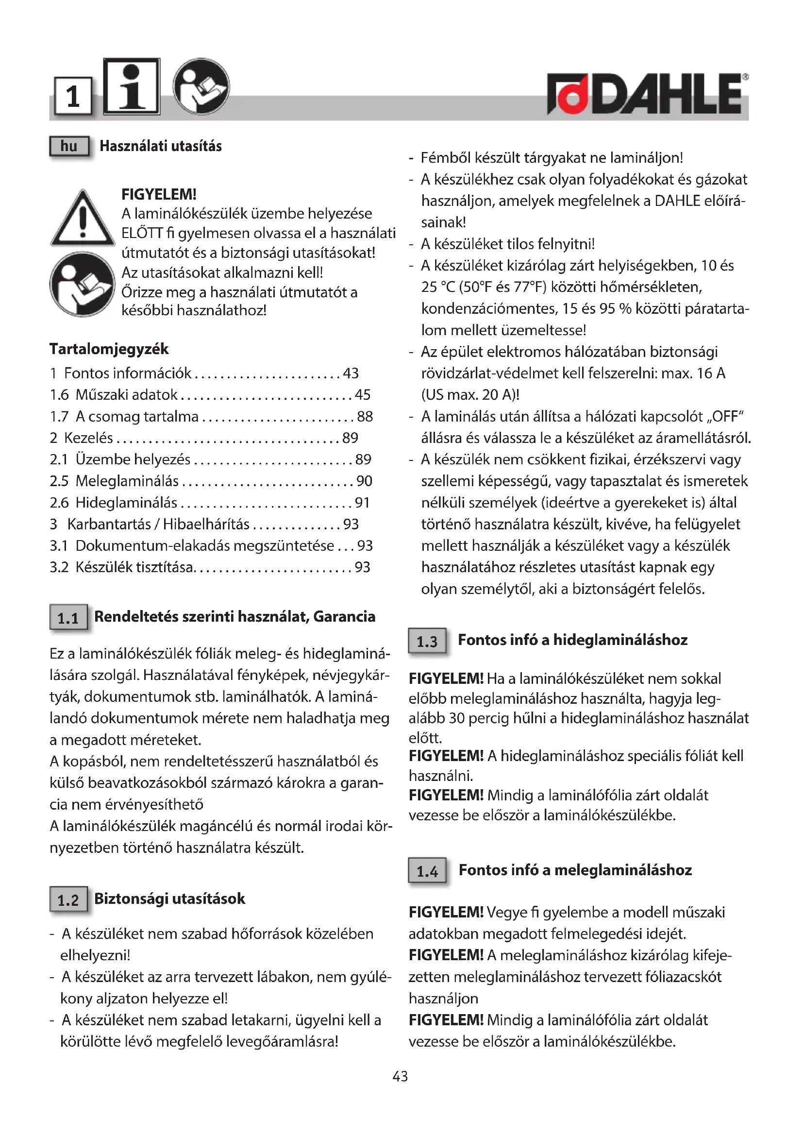 Használati utasítás FIGYELEM! A laminálókészülék üzembe helyezése ELŐTT gyelmesen olvassa el a használati útmutatót és a biztonsági utasításokat! Az utasításokat alkalmazni kell! Őrizze meg a használati útmutatót a későbbi használathoz! Tartalomjegyzék 1 Fontos információk . . . . . . . . . . . . . . . . . . . . . . . 43
