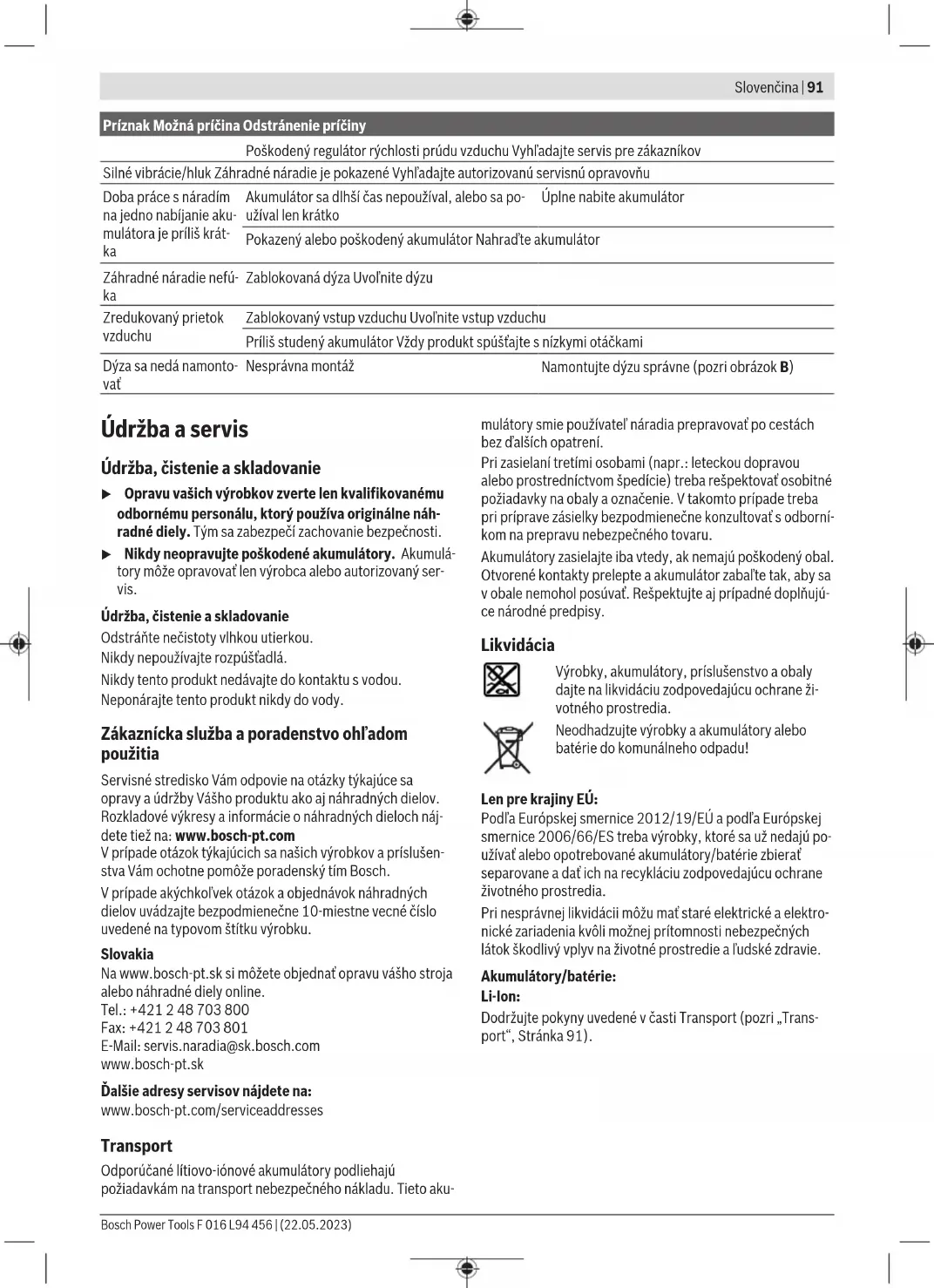 Zablokovaná dýza Uvoľnite dýzu Zredukovaný prietok vzduchu Zablokovaný vstup vzduchu Uvoľnite vstup vzduchu Príliš studený akumulátor Vždy produkt spúšťajte snízkymi otáčkami Dýza sa nedá namonto- vať Nesprávna montáž Namontujte dýzu správne (pozri obrázok B) Údržba a servis Údržba, čistenie a skladovanie u Opravu vašich výrobkov zverte len kvalifikovanému odbornému personálu, ktorý používa originálne náh- radné diely. Tým sa zabezpečí zachovanie bezpečnosti. u Nikdy neopravujte poškodené akumulátory. Akumulá- tory môže opravovať len výrobca alebo autorizovaný ser- vis. Údržba, čistenie a skladovanie Odstráňte nečistoty vlhkou utierkou. Nikdy nepoužívajte rozpúšťadlá. Nikdy tento produkt nedávajte do kontaktu svodou. Neponárajte tento produkt nikdy do vody. Zákaznícka služba aporadenstvo ohľadom použitia Servisné stredisko Vám odpovie na otázky týkajúce sa opravy aúdržby Vášho produktu ako aj náhradných dielov. Rozkladové výkresy ainformácie onáhradných dieloch náj- dete tiež na: www.bosch-pt.com Vprípade otázok týkajúcich sa našich výrobkov apríslušen- stva Vám ochotne pomôže poradenský tím Bosch. Vprípade akýchkoľvek otázok aobjednávok náhradných dielov uvádzajte bezpodmienečne 10‑miestne vecné číslo uvedené na typovom štítku výrobku. Slovakia Na www.bosch-pt.sk si môžete objednať opravu vášho stroja alebo náhradné diely online. Tel.: +421 2 48 703 800 Fax: +421 2 48 703 801 E-Mail: servis.naradia@sk.bosch.com www.bosch-pt.sk Ďalšie adresy servisov nájdete na: www.bosch-pt.com/serviceaddresses Transport Odporúčané lítiovo-iónové akumulátory podliehajú požiadavkám na transport nebezpečného nákladu. Tieto aku- mulátory smie používateľ náradia prepravovať po cestách bez ďalších opatrení. Pri zasielaní tretími osobami (napr.: leteckou dopravou alebo prostredníctvom špedície) treba rešpektovať osobitné požiadavky na obaly aoznačenie. Vtakomto prípade treba pri príprave zásielky bezpodmienečne konzultovať sodborní- kom na prepravu nebezpečného tovaru. Akumulátory zasielajte iba vtedy, ak nemajú poškodený obal. Otvorené kontakty prelepte aakumulátor zabaľte tak, aby sa vobale nemohol posúvať. Rešpektujte aj prípadné doplňujú- ce národné predpisy. Likvidácia Výrobky, akumulátory, príslušenstvo a obaly dajte na likvidáciu zodpovedajúcu ochrane ži- votného prostredia. Neodhadzujte výrobky a akumulátory alebo batérie do komunálneho odpadu! Len pre krajinyEÚ: Podľa Európskej smernice 2012/19/EÚ a podľa Európskej smernice 2006/66/ES treba výrobky, ktoré sa už nedajú po- užívať alebo opotrebované akumulátory/batérie zbierať separovane a dať ich na recykláciu zodpovedajúcu ochrane životného prostredia. Pri nesprávnej likvidácii môžu mať staré elektrické aelektro- nické zariadenia kvôli možnej prítomnosti nebezpečných látok škodlivý vplyv na životné prostredie aľudské zdravie. Akumulátory/batérie: Li-Ion: Dodržujte pokyny uvedené včasti Transport (pozri „Trans- port“, Stránka91). Bosch Power Tools F 016 L94 456 | (22.05.2023)92 | Magyar Magyar Biztonsági előírások A kerti kisgépen található jelek és jelzések magyarázata Általános tájékoztató a veszélyekről. Gondosan olvassa el az Üzemeltetési útmuta- tót. Esőben ne használja. FIGYELMEZTETÉS: Ügyeljen a kirepített tár- gyakra. FIGYELMEZTETÉS: Tartsa távol a közelben tar- tózkodókat. Ne nyúljon a kezével, lábával vagy bő ruhával a nyílásokba, amíg a termék működésben van. Forgó fúvóberendezés. Ne nyúljon a kezével, lábával, a hosszú hajával vagy a bő ruhájával a nyílásokba, amíg a termék működésben van. Viseljen védőszemüveget és fülvédőt. FIGYELMEZTETÉS: A karbantartási munkák megkezdése előtt válassza le az akkumulátort. Általános biztonsági előírások az elektromos kéziszerszámokhoz FIGYELMEZ- TETÉS Olvassa el valamennyi biztonsági tájékoztatót, előírást, illusztrációt és adatot, amelyet az elektromos kéziszerszámmal együtt megkapott. Az alábbiakban felso- rolt előírások betartásának elmulasztása áramütéshez, tűz- höz és/vagy súlyos testi sérülésekhez vezethet. Kérjük a későbbi használatra gondosan őrizze meg eze- ket az előírásokat. Az alább alkalmazott "elektromos kéziszerszám" fogalom a hálózati elektromos kéziszerszámokat (hálózati csatlakozó kábellel) és az akkumulátoros elektromos kéziszerszámokat (hálózati csatlakozó kábel nélkül) foglalja magában. Munkahelyi biztonság u Tartsa tisztán és jól megvilágítva a munkaterületet. A zsúfolt vagy sötét területeken gyakrabban következnek be balesetek. u Tartsa távol a gyerekeket és a nézelődőket, ha az elektromos kéziszerszámot használja. Haelvonják a fi- gyelmét, elvesztheti az uralmát a berendezés felett. u Üzem közben a berendezéstől mért 3m sugarú körön belül a kezelőn kívül más személyek, illetve állatok nem tartózkodhatnak. A szemetet sohasem szabad a kö- zelben álló személyek felé fújni. u A termék üzemeltetése során ügyeljen a nem hallható veszélyekre is. u Ügyeljen rá, hogy ne botoljon bele a készülékbe, ha azt a földre állította. u A más személyek által elszenvedett balesetekért, illet- ve a más tulajdonában keletkezett károkért a kezelő vagy felhasználó felel. Elektromos biztonsági előírások u Kerülje el a földelt felületekkel való érintkezést, mint például csövek, fűtőtestek, kályhák és hűtőgépek. Az áramütés veszélye megnövekszik, ha a teste földelve van. u Tartsa távol az elektromos kéziszerszámot az esőtől és a nedvességtől. Ha víz hatol be egy elektromos kézi- szerszámba, ez megnöveli az áramütés veszélyét. u Kerülje a rossz időjárási feltételeket, főleg ha viharve- szé