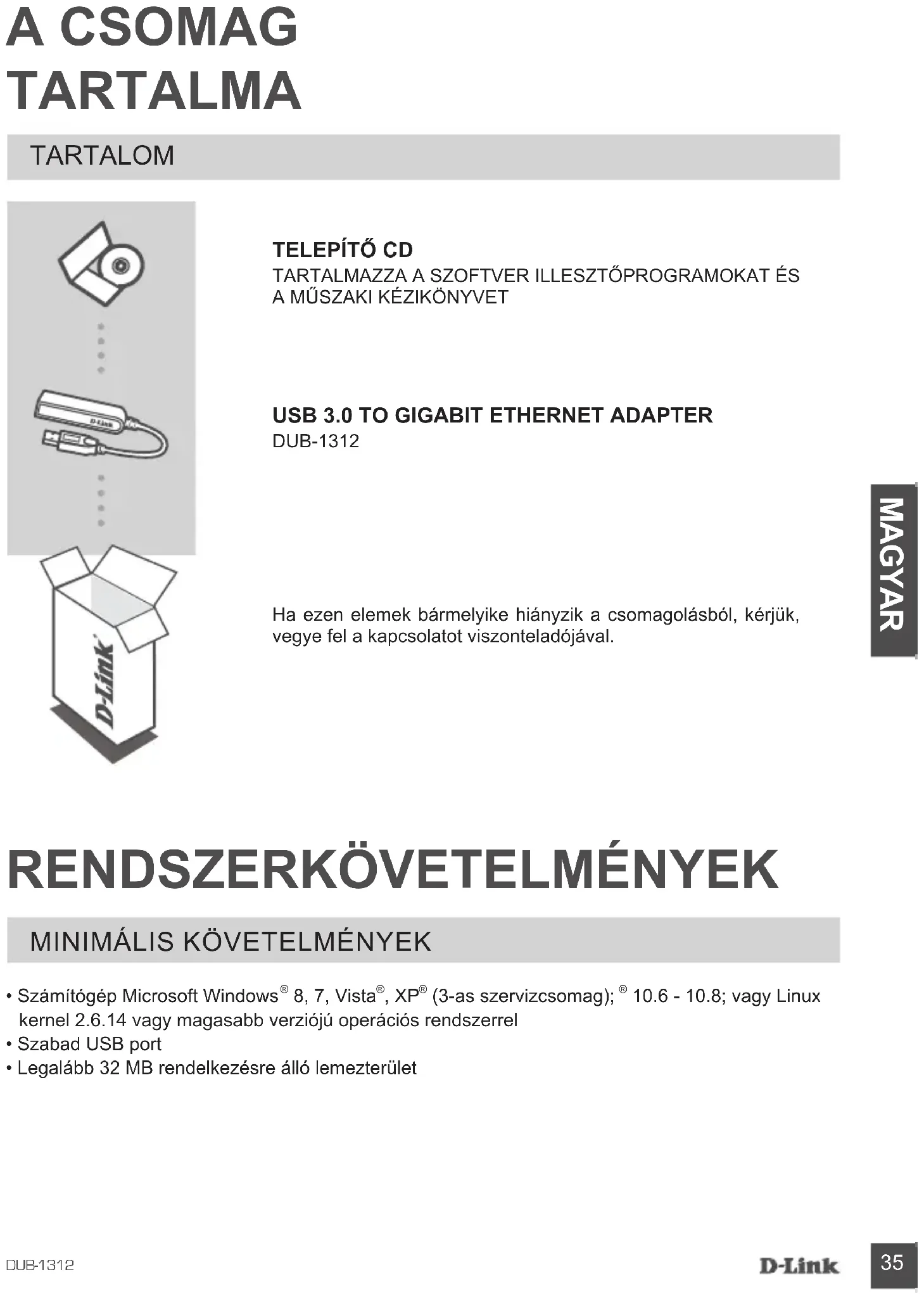 USB 3.0 TO GIGABIT ETHERNET AdAPTER DUB-1312 TARTALOM Ha ezen elemek bármelyike hiányzik a csomagolásból, kérjük, vegye fel a kapcsolatot viszonteladójával.