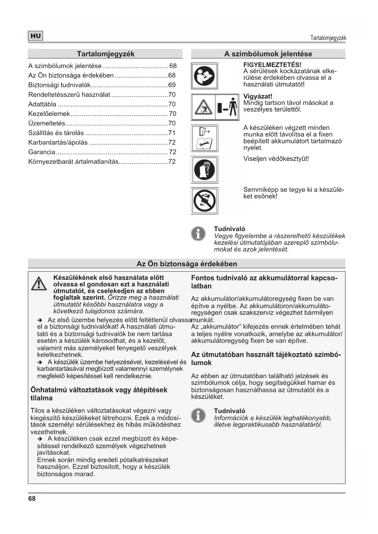 - Készülékénekelsőhasználataelőtt olvassa el gondosan ezt a használati útmutatót, és cselekedjen az ebben foglaltak szerint. Őrizze meg a használati útmutatót későbbi használatra vagy a következő tulajdonos számára. Î Az első üzembe helyezés előtt feltétlenül olvassa el a biztonsági tudnivalókat! A használati útmu- tató és a biztonsági tudnivalók be nem tartása esetén a készülék károsodhat, és a kezelőt, valamint más személyeket fenyegető veszélyek keletkezhetnek. Î A készülék üzembe helyezésével, kezelésével és karbantartásával megbízott valamennyi személynek megfelelő képesítéssel kell rendelkeznie. Önhatalmú változtatások vagy átépítések tilalma Tilos a készüléken változtatásokat végezni vagy kiegészítő készülékeket létrehozni. Ezek a módosí- tások személyi sérülésekhez és hibás működéshez vezethetnek. Î A készüléken csak ezzel megbízott és képe- sítéssel rendelkező személyek végezhetnek javításokat. Ennek során mindig eredeti pótalkatrészeket használjon. Ezzel biztosított, hogy a készülék biztonságos marad. Fontos tudnivaló az akkumulátorral kapcso- latban Az akkumulátor/akkumulátoregység xen be van építve a nyélbe. Az akkumulátoron/akkumuláto- regységen csak szakszerviz végezhet bármilyen munkát. Az „akkumulátor” kifejezés ennek értelmében tehát a teljes nyélre vonatkozik, amelybe az akkumulátor/ akkumulátoregység xen be van építve. Az útmutatóban használt tájékoztató szimbó- lumok Az ebben az útmutatóban található jelzések és szimbólumok célja, hogy segítségükkel hamar és biztonságosan használhassa az útmutatót és a készüléket. Tudnivaló Információk a készülék leghatékonyabb, illetve legpraktikusabb használatáról. Tartalomjegyzék A szimbólumok jelentése p. 68
