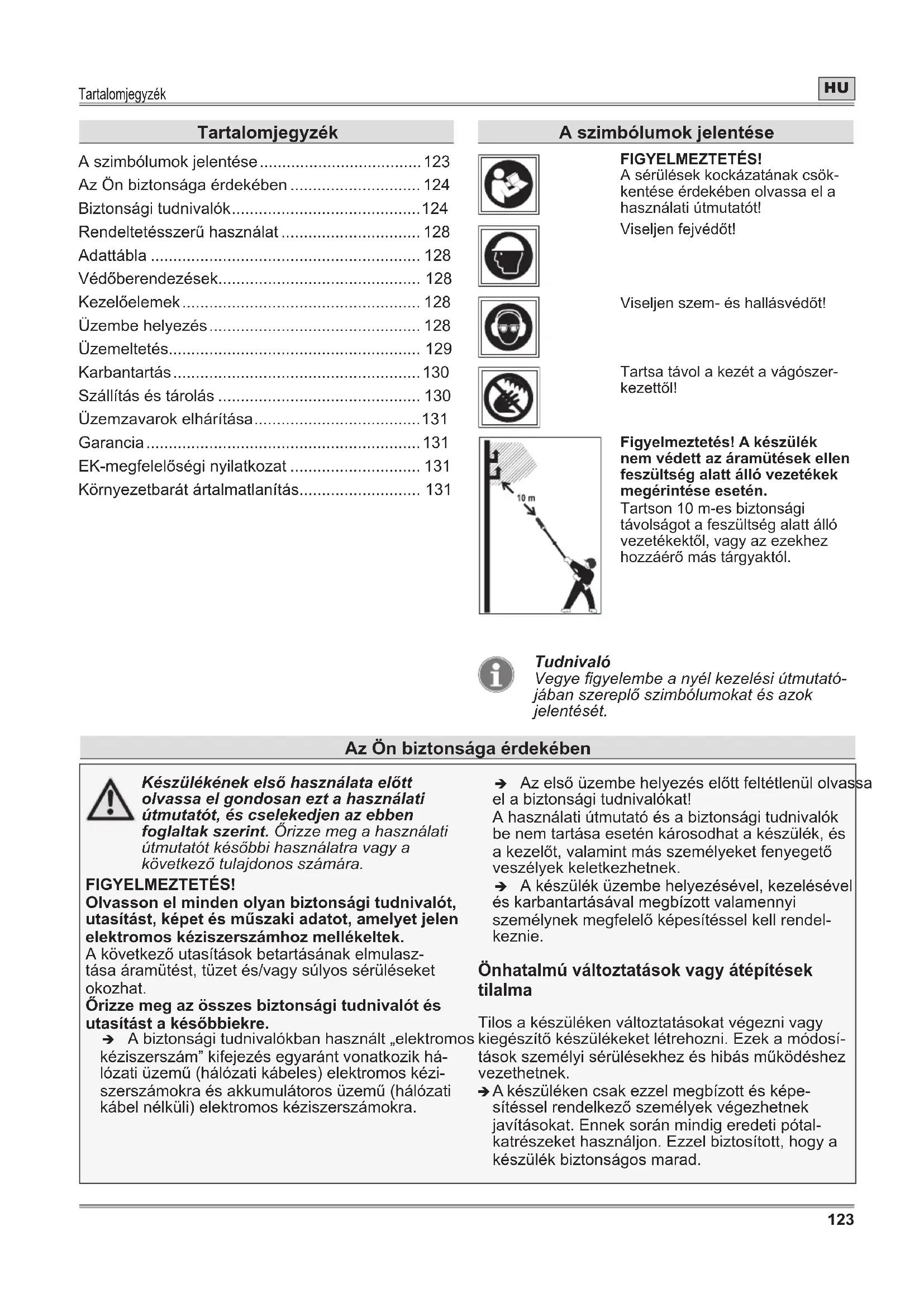 - Környezetbarát ártalmatlanítás A szimbólumok jelentése FIGYELMEZTETÉS! A sérülések kockázatának csök- kentése érdekében olvassa el a használati útmutatót! Viseljen fejvédőt! Viseljen szem- és hallásvédőt! Tartsa távol a kezét a vágószer- kezettől! Figyelmeztetés! A készülék nem védett az áramütések ellen feszültség alatt álló vezetékek megérintése esetén. Tartson 10 m-es biztonsági távolságot a feszültség alatt álló vezetékektől, vagy az ezekhez hozzáérő más tárgyaktól. Tudnivaló Vegye gyelembe a nyél kezelési útmutató- jában szereplő szimbólumokat és azok jelentését. Az Ön biztonsága érdekében Készülékének első használata előtt olvassa el gondosan ezt a használati útmutatót, és cselekedjen az ebben foglaltak szerint. Őrizze meg a használati útmutatót későbbi használatra vagy a következő tulajdonos számára. FIGYELMEZTETÉS! Olvasson el minden olyan biztonsági tudnivalót, utasítást, képet és műszaki adatot, amelyet jelen elektromos kéziszerszámhoz mellékeltek. A következő utasítások betartásának elmulasz- tása áramütést, tüzet és/vagy súlyos sérüléseket okozhat. Őrizze meg az összes biztonsági tudnivalót és utasítást a későbbiekre. Î A biztonsági tudnivalókban használt „elektromos kéziszerszám” kifejezés egyaránt vonatkozik há- lózati üzemű (hálózati kábeles) elektromos kézi- szerszámokra és akkumulátoros üzemű (hálózati kábel nélküli) elektromos kéziszerszámokra. Î Az első üzembe helyezés előtt feltétlenül olvassa el a biztonsági tudnivalókat! A használati útmutató és a biztonsági tudnivalók be nem tartása esetén károsodhat a készülék, és a kezelőt, valamint más személyeket fenyegető veszélyek keletkezhetnek. Î A készülék üzembe helyezésével, kezelésével és karbantartásával megbízott valamennyi személynek megfelelő képesítéssel kell rendel- keznie. Önhatalmú változtatások vagy átépítések tilalma Tilos a készüléken változtatásokat végezni vagy kiegészítő készülékeket létrehozni. Ezek a módosí- tások személyi sérülésekhez és hibás működéshez vezethetnek. Î A készüléken csak ezzel megbízott és képe- sítéssel rendelkező személyek végezhetnek javításokat. Ennek során mindig eredeti pótal- katrészeket használjon. Ezzel biztosított, hogy a készülék biztonságos marad.Az Ön biztonsága érdekében p. 131