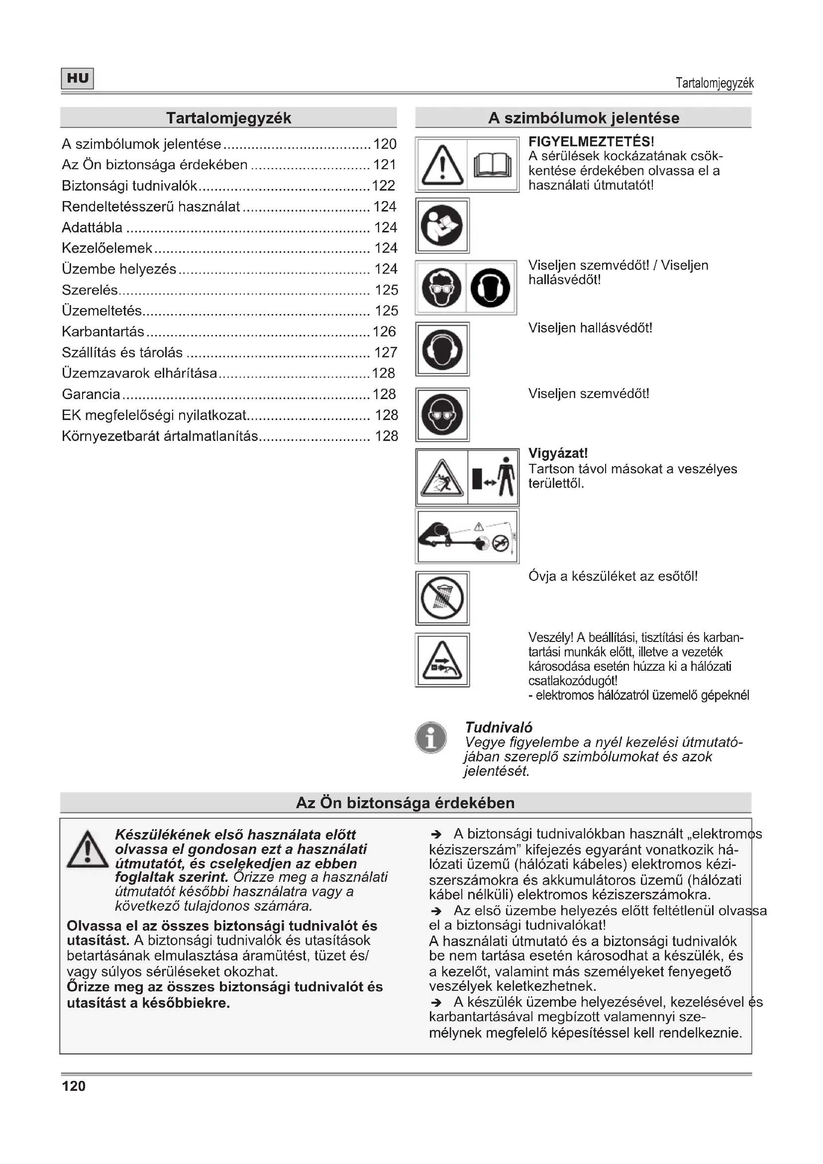 - Környezetbarát ártalmatlanítás A szimbólumok jelentése FIGYELMEZTETÉS! A sérülések kockázatának csök- kentése érdekében olvassa el a használati útmutatót! Viseljen szemvédőt! / Viseljen hallásvédőt! Viseljen hallásvédőt! Viseljen szemvédőt! Vigyázat! Tartson távol másokat a veszélyes területtől. Óvja a készüléket az esőtől! Veszély! A beállítási, tisztítási és karban- tartási munkák előtt, illetve a vezeték károsodása esetén húzza ki a hálózati csatlakozódugót! - elektromos hálózatról üzemelő gépeknél Tudnivaló Vegye gyelembe a nyél kezelési útmutató- jában szereplő szimbólumokat és azok jelentését. Az Ön biztonsága érdekében Készülékének első használata előtt olvassa el gondosan ezt a használati útmutatót, és cselekedjen az ebben foglaltak szerint. Őrizze meg a használati útmutatót későbbi használatra vagy a következő tulajdonos számára. Olvassa el az összes biztonsági tudnivalót és utasítást. A biztonsági tudnivalók és utasítások betartásának elmulasztása áramütést, tüzet és/ vagy súlyos sérüléseket okozhat. Őrizze meg az összes biztonsági tudnivalót és utasítást a későbbiekre. Î A biztonsági tudnivalókban használt „elektromos kéziszerszám” kifejezés egyaránt vonatkozik há- lózati üzemű (hálózati kábeles) elektromos kézi- szerszámokra és akkumulátoros üzemű (hálózati kábel nélküli) elektromos kéziszerszámokra. Î Az első üzembe helyezés előtt feltétlenül olvassa el a biztonsági tudnivalókat! A használati útmutató és a biztonsági tudnivalók be nem tartása esetén károsodhat a készülék, és a kezelőt, valamint más személyeket fenyegető veszélyek keletkezhetnek. Î A készülék üzembe helyezésével, kezelésével és karbantartásával megbízott valamennyi sze- mélynek megfelelő képesítéssel kell rendelkeznie.Az Ön biztonsága érdekében p. 128