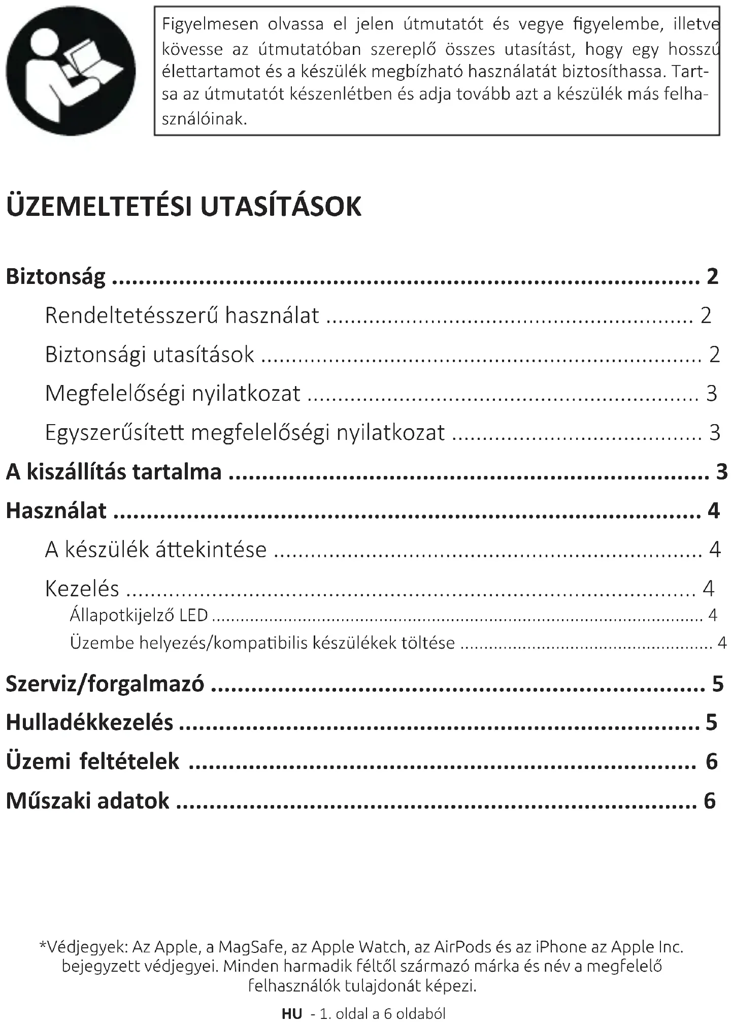 - Műszaki adatok HU - 1. oldal a 6 oldaból *Védjegyek: Az Apple, a MagSafe, az Apple Watch, az AirPods és az iPhone az Apple Inc. bejegyzett védjegyei. Minden harmadik féltől származó márka és név a megfelelő felhasználók tulajdonát képezi.HU - 1. oldal a 6 oldaból BIZTONSÁG Rendeltetésszerű használat Ez a termék okostelefonok, Apple Watch (3-as sorozat és újabb) és fejhallgatók (AirPods és más, vezeték nélküli töltést támogató modellek) vezeték nélküli töltésére szolgál. Másfajta vagy ezen túlmenő alkalmazás nem rendeltetésszerűnek tekinthető és meghibásodásokhoz, illetve személyi sérülésekhez vezethet. A ter- méket nem szánták kereskedelmi használatra vagy orvosi és speciális alkalmazásokra, amelyeknél a termék meghibásodása sérüléseket, halálesetet vagy jelentős anyagi károkat okozhat. A rendeltetéssel ellentétes használatból vagy a biztonsági utasítások be nem tartásából eredő károk esetén semmiféle igénnyel fellépni nem lehet. Bármikor, előzetes bejelentés nélkül, végezhetők módosítások a rmware-nél és/vagy a hardvernél. Ezért előfordulhat, hogy jelen útmutató részei, jelen dokumentáció műszaki adatai és képei kissé eltérnek az Ön birtokában lévő terméktől. Jelen útmutatóban leírt összes pont csak a pontosítást szolgálja és nem kell me- gegyeznie egy ado helyzeel. Nem érvényesíthetők jogi követelések jelen útmutató alapján. Biztonsági utasítások Veszélyek gyermekek és korlátozo zikai, érzékelési vagy szellemi képességű személyek számára: A gyermekek gyakran alábecsülik a veszélyeket vagy egyáltalán nem ismerik fel őket. Jelen terméket nem arra tervezték, hogy olyan személyek használják, akiknek korlátozo érzékelési, zikai vagy szellemi képes- ségeik vannak vagy nincs tapasztalatuk a készülék kezelésében, és/vagy nem ismerik a készüléket, hacsak a készülék használata közben nem felügyeli őket egy olyan személy, aki felelős a biztonságukért vagy utasí- tásokkal látja el őket a készülék használatát tekintően és megérk a használatból keletkező veszélyeket. A gyermekek felügyelet nélkül nem nyúlhatnak a készülékhez. Gondoskodjon arról, hogy a gyermekek nem játszanak a készülékkel. Fulladásveszély! A gyerekek szájukba vehek a csomagolófóliát vagy apró alkatrészeket, és megfulladhatnak. Sérülésveszély! Ha szívritmusszabályzóval vagy más műszaki implantátummal rendelkezik, az indukv töltőállomás haszná- lata elő forduljon orvoshoz vagy az implantátum gyártójához. Ne nyissa fel a hálóza adapter készülékházát. A kinyito készülékház esetén életveszély áll fenn elektromos áramütés által. Nincsenek karbantartható alkatrészek. Botlásveszély! A készülék elhelyezésekor gyeljen arra, hogy senki ne léphessen a kábelre vagy ne botolhasson meg benne. A kábelre ne helyezzen tárgyakat. Rövidzárlat veszélye! Ne dugjon olyan tárgyakat a termék nyílásába, amelyeket nem a használatra terveztek. Ne kezelje a készülé- ket vizes kézzel. Ez elektromos rövidzárlatból származó személyi sérülést és/vagy tüzet okozhat. Ne használja a készüléket, ha magán az eszközön vagy az USB-kábelen látható sérülések vannak, mert ez sérülést vagy károsodást okozhat. HU - 2. oldal a 6 oldabólA készüléket ne tegye ki fröccsenő vagy csepegő víz hatásának. Folyadékkal töltö edényeket (vázákat, poharakat vagy hasonlókat) nem szabad a készülékre vagy annak közvetlen közelébe helyezni. Fennáll annak a veszélye, hogy az edény felborul, és a folyadék károsan befo- lyásolja az elektromos biztonságot. A készülék használat közben hőt termel, ez normális jelenségnek számít. A túlmelegedés elkerülése érdeké- ben használat közben ne takarja le teljesen a terméket. Károsodás! Ne használja a készüléket extrém hideg, forró, nedves vagy poros vidékeken. Ugyanakkor ne tegye ki a közvetlen napsugárzásnak. Kérjük, ne használjon vizet vagy vegyi oldatokat a készülék sztásához. Kérjük, erre a célra csak száraz törlőkendőt használjon. Ne szerelje szét a készüléket az alkotóelemeire és ne próbálja azt saját maga megváltoztatni vagy megjavíta- ni. Nem tartalmaz karbantartandó részeket és ebben az esetben a garancia érvényét vesz. Kerülje a készülék erős ütését. A hálóza adaptert csak AC 100-240V~, 50/60 Hz, földelt dugaszoló aljzatoknál üzemeltesse. Ha nem biztos az áramellátással kapcsolatosan a felállítási helyen, kérdezzen rá az illetékes energiaszolgáltatónál. Az áramellátás megszakításához a készülékén, húzza ki a tápegységet a dugaszoló aljzatból. Kihúzáskor min- dig tartsa meg a tápegységet. Soha ne a kábeltől fogva rántsa ki. Megfelelőségi nyilatkozat A CE jelölés kimondja, hogy jelen termék teljesí a termékre vonatkozó, érvényben lévő összes EU irányelv előírásait. Egyszerűsíte megfelelőségi nyilatkozat Az Intenso Internaonal kijelen, hogy a Wireless Charger BS13 pusú rádióberendezés megfelel a 2014/53/EU irányelvnek. Az EU-megfelelőségi nyilatkozat teljes szövege a következő internetes címen ér- hető el: www.intenso.eu. p. 6