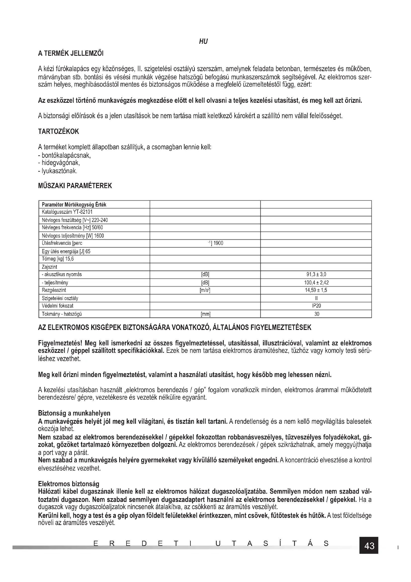 Paraméter Mértékegység Érték Katalógusszám YT-82101 Névleges feszültség [V~] 220-240 Névleges frekvencia [Hz] 50/60 Névleges teljesítmény [W] 1600 Ütésfrekvencia [perc