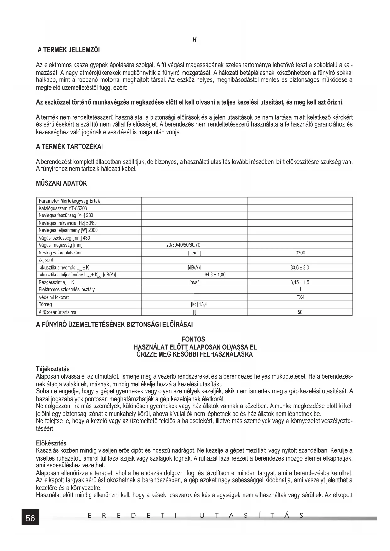 ] 3,45 ± 1,5 Elektromos szigetelési osztály II Védelmi fokozat IPX4 Tömeg [kg] 13,4 A fűkosár űrtartalma [l] 50 A FŰNYÍRÓ ÜZEMELTETÉSÉNEK BIZTONSÁGI ELŐÍRÁSAI FONTOS! HASZNÁLAT ELŐTT ALAPOSAN OLVASSA EL ŐRIZZE MEG KÉSŐBBI FELHASZNÁLÁSRA Tájékoztatás Alaposan olvassa el az útmutatót. Ismerje meg a vezérlő rendszereket és a berendezés helyes működtetését. Ha a berendezés- nek átadja valakinek, másnak, mindig mellékelje hozzá a kezelési utasítást. Soha ne engedje, hogy a gépet gyermekek vagy olyan személyek kezeljék, akik nem ismerték meg a gép kezelési utasítását. A hazai jogszabályok pontosan meghatározhatják a gép kezelőjének életkorát. Ne dolgozzon, ha más személyek, különösen gyermekek vagy háziállatok vannak a közelben. A munka megkezdése előtt ki kell jelölni egy biztonsági zónát a munkahely körül, ahova kívülállók nem léphetnek be és háziállatok nem léphetnek be. Ne felejtse le, hogy a kezelő vagy az üzemeltető felelős a balesetekért, illetve más személyek vagy a környezetet veszélyezte- téséért. Előkészítés Kaszálás közben mindig viseljen erős cipőt és hosszú nadrágot. Ne kezelje a gépet mezítláb vagy nyitott szandálban. Kerülje a viseltes ruházatot, amiről túl laza szíjak vagy szalagok lógnak. A ruházat laza részeit a berendezés mozgó elemei elkaphatják, ami sebesüléshez vezethet. Alaposan ellenőrizze a terepet, ahol a berendezés dolgozni fog, és távolítson el minden tárgyat, ami a berendezésbe kerülhet. Az elkapott tárgyak sérülést okozhatnak a berendezésben, a gép azokat nagy sebességgel kidobhatja, ami veszélyt jelenthet a kezelőre és a környezetre. Használat előtt mindig ellenőrizni kell, hogy a kések, csavarok és kés alegységek nem elhasználtak vagy sérültek. Az elkopott57