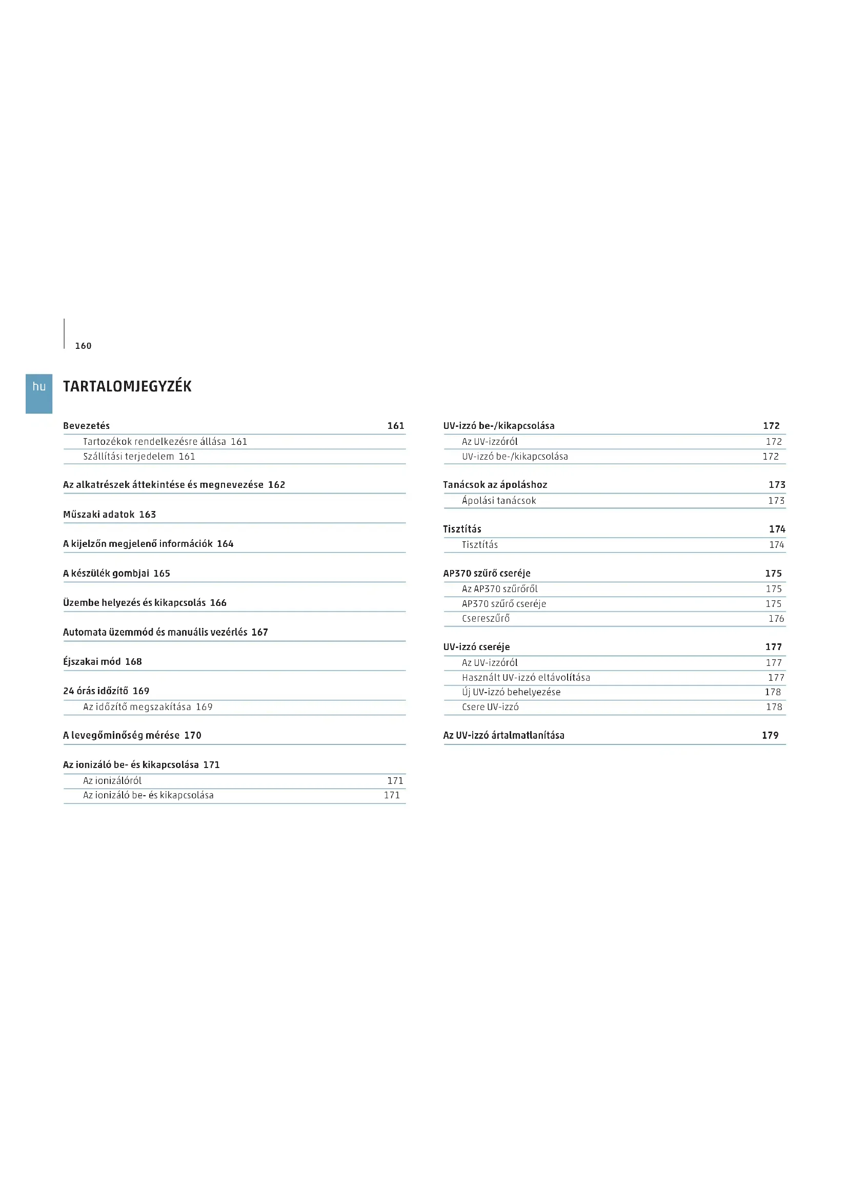 TARTALOMJEGYZÉK Bevezetés 161 Tartozékok rendelkezésre állása 161 Szállítási terjedelem 161 Az alkatrészek áttekintése és megnevezése 162 Műszaki adatok 163 A kijelzőn megjelenő információk 164 A készülék gombjai 165 Üzembe helyezés és kikapcsolás 166 Automata üzemmód és manuális vezérlés 167 Éjszakai mód 168 24 órás időzítő 169 Az időzítő megszakítása 169 A levegőminőség mérése 170 Az ionizáló be- és kikapcsolása 171 Az ionizálóról 171 Az ionizáló be- és kikapcsolása 171 UV-izzó be-/kikapcsolása 172 Az UV-izzóról 172 UV-izzó be-/kikapcsolása 172 Tanácsok az ápoláshoz 173 Ápolási tanácsok 173 Tisztítás 174 Tisztítás 174 AP370 szűrő cseréje 175 Az AP370 szűrőről 175 AP370 szűrő cseréje 175 Csereszűrő 176 UV-izzó cseréje 177 Az UV-izzóról 177 Használt UV-izzó eltávolítása 177 Új UV-izzó behelyezése 178 Csere UV-izzó 178 Az UV-izzó ártalmatlanítása 179161