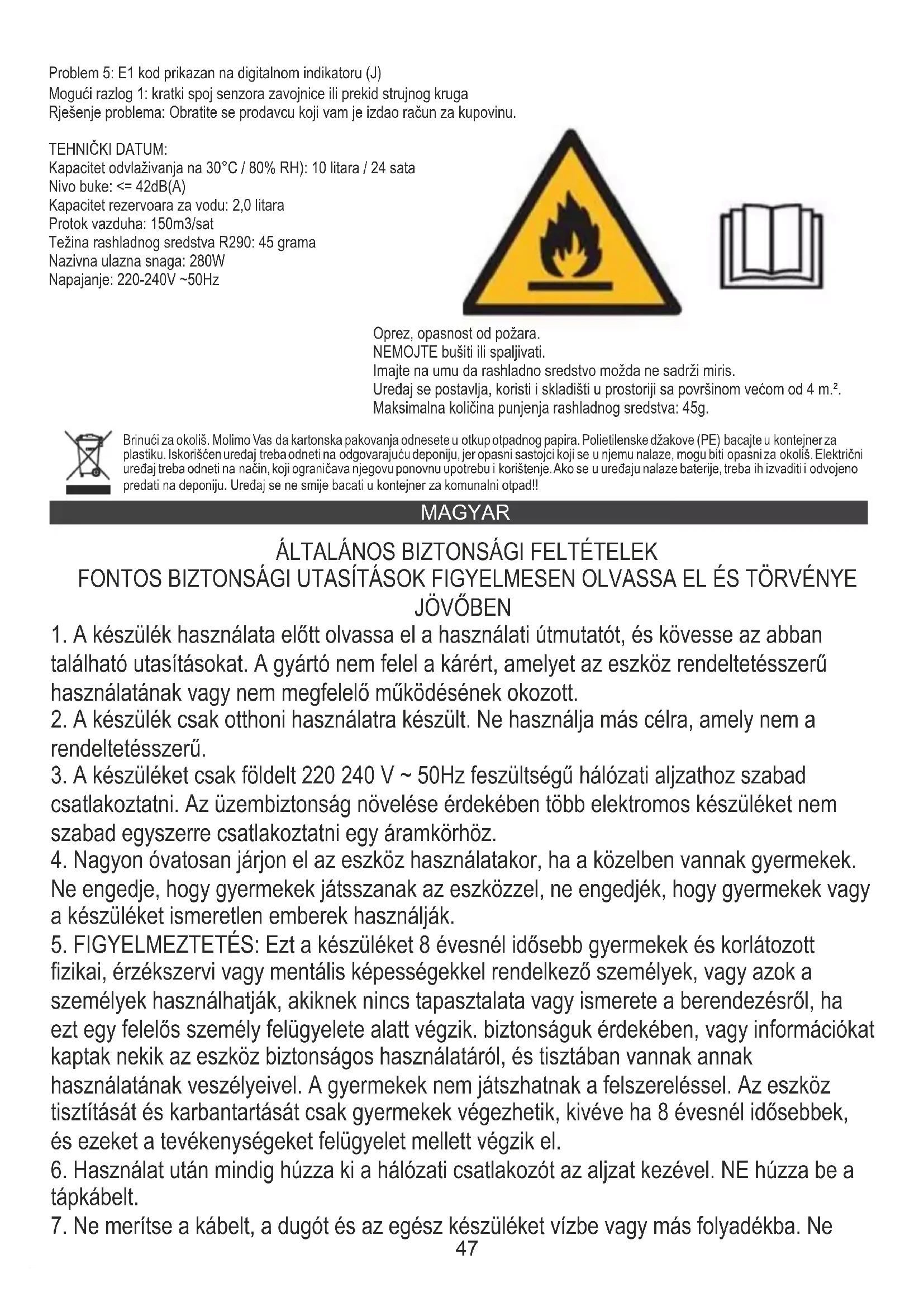 Lehetséges ok 1: A készülék megdőlt vagy bizonytalan helyzetben van?51 A környezet védelme érdekében kérjük külön karton dobozok és műanyag zsákokat és dobja őket a megfelelő hulladék közé. Használt készüléket kell eljuttatni a kijelölt gyűjtőhelyekre miatt veszélyes elemek alkatrészeket, amelyek hatással lehetnek a környezetre. Ne dobja a készüléket a közös szemétkosárba. SUOMI Vigyázat, tűzveszély. NE szúrja ki vagy égesse el. Ügyeljen arra, hogy a hűtőközeg nem tartalmazhat szagot. A készüléket 4 m²-nél nagyobb alapterületű helyiségben kell felszerelni, üzemeltetni és tárolni. A hűtőközeg maximális mennyisége: 45 g. YLEISET TURVALLISUUSOLOSUHTEET TÄRKEITÄ TURVAOHJEITA LUE HUOLELLISESTI JA SÄILYTÄ TULEVAISUUTTA