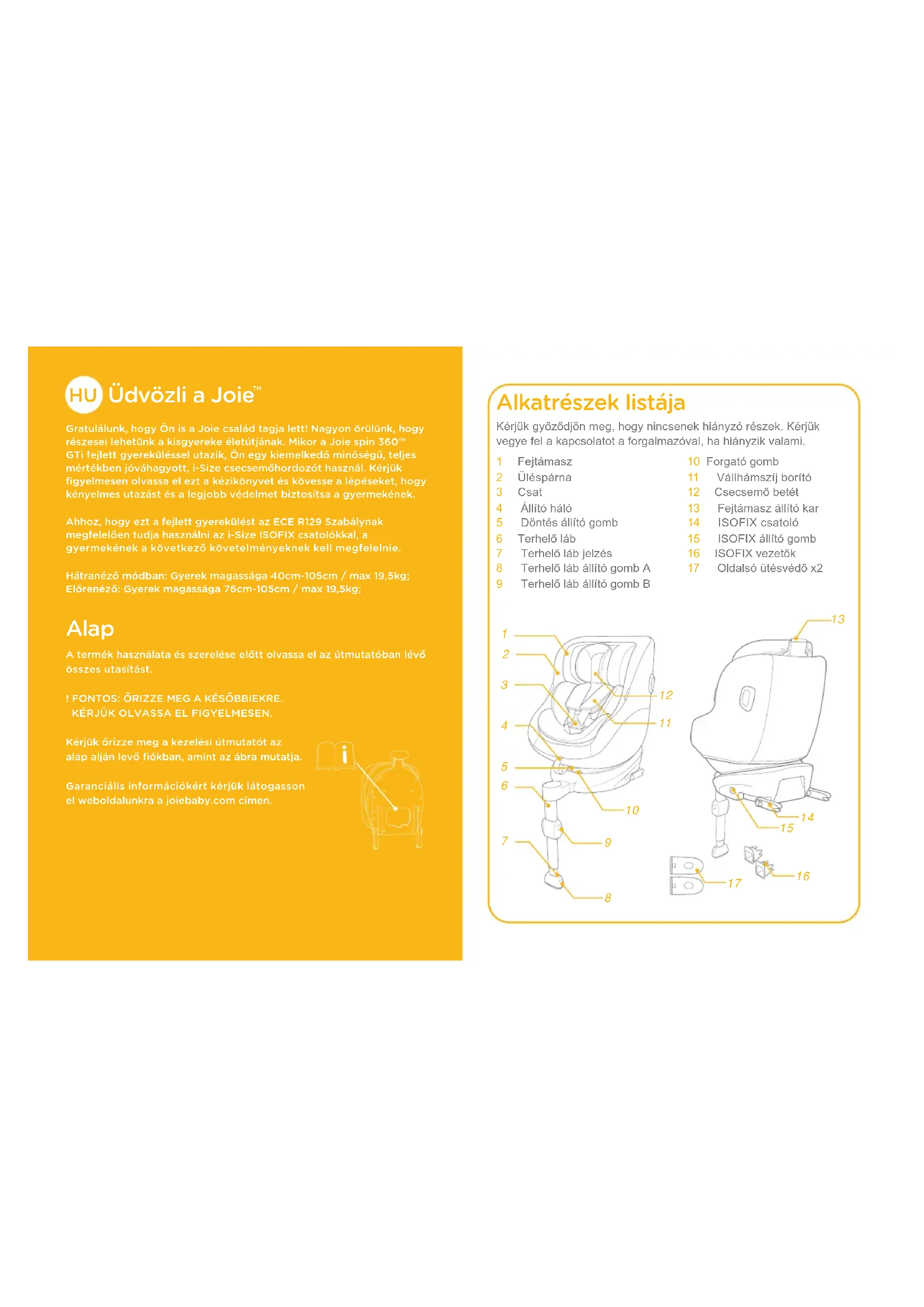 Gratulálunk, hogy Ön is a Joie család tagja lett! Nagyon örülünk, hogy részesei lehetünk a kisgyereke életútjának. Mikor a Joie spin 360™ GTi fejlett gyereküléssel utazik, Ön egy kiemelkedő minőségű, teljes mértékben jóváhagyott, i-Size csecsemőhordozót használ. Kérjük figyelmesen olvassa el ezt a kézikönyvet és kövesse a lépéseket, hogy kényelmes utazást és a legjobb védelmet biztosítsa a gyermekének.Ahhoz, hogy ezt a fejlett gyerekülést az ECE R129 Szabálynak megfelelően tudja használni az i-Size ISOFIX csatolókkal, a gyermekének a következő követelményeknek kell megfelelnie.Hátranéző módban: Gyerek magassága 40cm-105cm / max 19,5kg;Előrenéző: Gyerek magassága 76cm-105cm / max 19,5kg; Alap A termék használata és szerelése előtt olvassa el az útmutatóban lévő összes utasítást.! FONTOS: ŐRIZZE MEG A KÉSŐBBIEKRE.KÉRJÜK OLVASSA EL FIGYELMESEN.Kérjük őrizze meg a kezelési útmutatót az alap alján levő fiókban, amint az ábra mutatja.Garanciális információkért kérjük látogasson el weboldalunkra a joiebaby.com címen. Alkatrészek listája 1 Fejtámasz2 Üléspárna3 Csat4 Állítóháló5 Döntésállítógomb6 Terhelőláb7 Terhelőlábjelzés8 TerhelőlábállítógombA9 TerhelőlábállítógombB10 Forgatógomb11 Vállhámszíjborító12 Csecsemőbetét13 Fejtámaszállítókar14 ISOFIXcsatoló15 ISOFIXállítógomb16 ISOFIXvezetők17 Oldalsóütésvédőx2Kérjükgyőződjönmeg,hogynincsenekhiányzórészek.Kérjükvegyefelakapcsolatotaforgalmazóval,hahiányzikvalami.