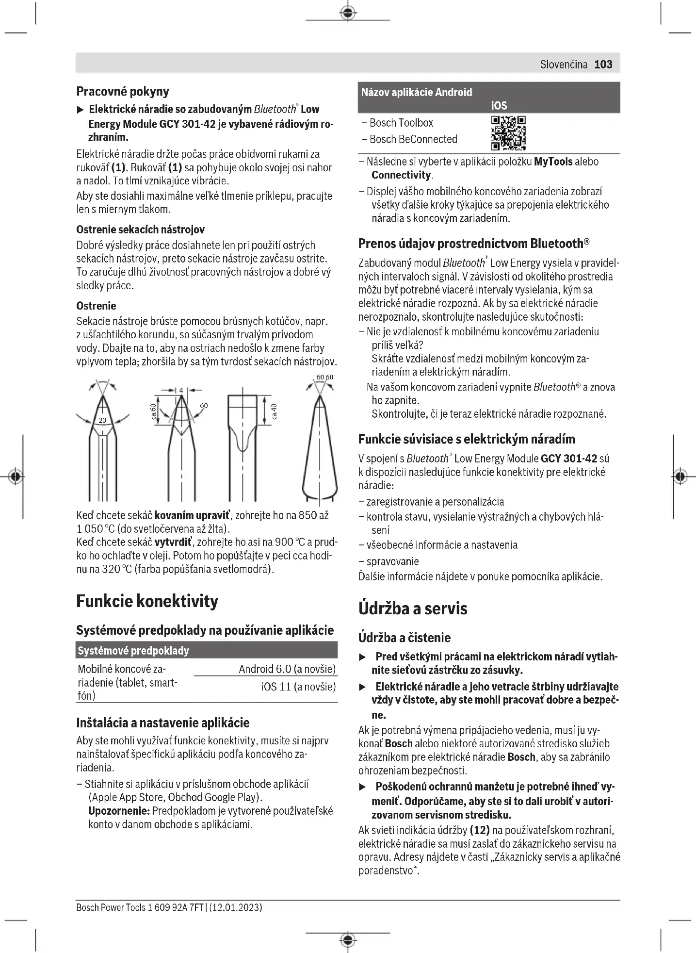 A kovácsoláshoz hevítse fel a vésőt 850–1 050 °C-ra (vilá- gossárga – sárga). Az edzéshez hevítse fel a vésőt kb. 900 °C hőmérsékletre, majd olajban hűtse le. Ezután egy kemencében kb. egy órán át 320°C hőmérsékleten (megeresztési szín: világoskék) eressze meg. Konnektivitási funkciók Az app alkalmazásához szükséges rendszerkövetelmények Rendszerkövetelmények Mobil végberendezés (tablet, okostelefon) Android6.0 (és újabb verziók) iOS11 (és újabb verziók) Az app telepítése és beállítása A Connectivity funkciók használatához először telepítenie kell a – végberendezéstől függő specifikus – alkalmazást. – Töltse le egy megfelelő alkalmazásáruházból (AppleApp Store, Google Play Store) az alkalmazást. Figyelem: Ennek feltétele, hogy Önnek legyen a megfele- lő alkalmazásáruháznál felhasználói fiókja. Az alkalmazás neve Android iOS – Bosch Toolbox – Bosch BeConnected – Ezután jelölje ki az alkalmazásban a MyTools vagy a Con- nectivity alpontot. – Mobil eszköze kijelzőjén megjelenik az összes további lé- pés leírása, amelyre az elektromos kéziszerszám és a mo- bil eszköz összekapcsolásához szükség van. Adatátvitel a Bluetooth®-on át A beépített Bluetooth