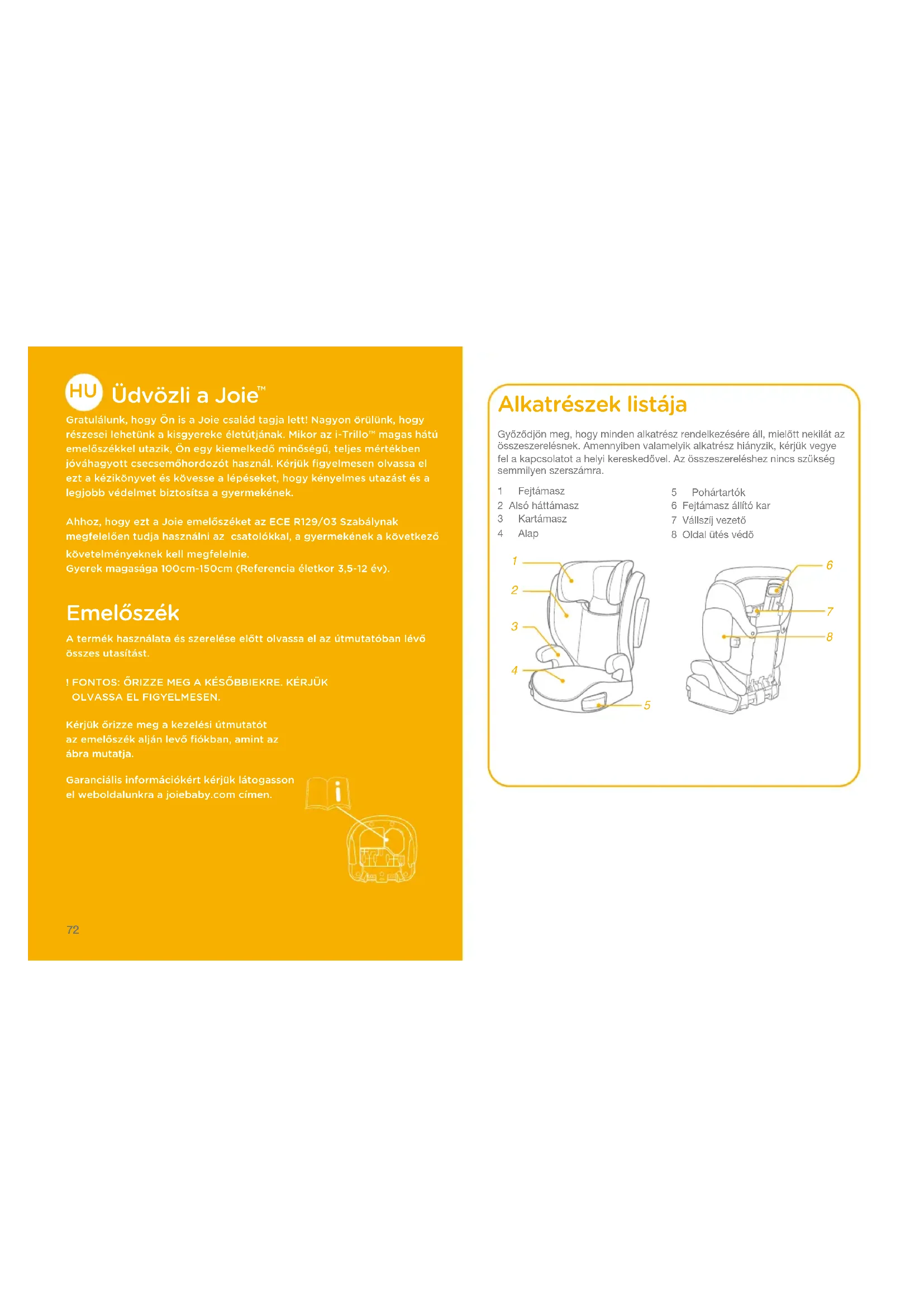 Gratulálunk, hogy Ön is a Joie család tagja lett! Nagyon örülünk, hogy részesei lehetünk a kisgyereke életútjának. Mikor az i-Trillo™ magas hátú emelőszékkel utazik, Ön egy kiemelkedő minőségű, teljes mértékben jóváhagyott csecsemőhordozót használ. Kérjük figyelmesen olvassa el ezt a kézikönyvet és kövesse a lépéseket, hogy kényelmes utazást és a legjobb védelmet biztosítsa a gyermekének.Ahhoz, hogy ezt a Joie emelőszéket az ECE R129/03 Szabálynak megfelelően tudja használni az csatolókkal, a gyermekének a következő követelményeknek kell megfelelnie.Gyerek magasága 100cm-150cm (Referencia életkor 3,5-12 év). Emelőszék A termék használata és szerelése előtt olvassa el az útmutatóban lévő összes utasítást.! FONTOS: ŐRIZZE MEG A KÉSŐBBIEKRE. KÉRJÜK OLVASSA EL FIGYELMESEN.Kérjük őrizze meg a kezelési útmutatót az emelőszék alján levő fiókban, amint az ábra mutatja.Garanciális információkért kérjük látogasson el weboldalunkra a joiebaby.com címen. Alkatrészek listája Győződjön meg, hogy minden alkatrész rendelkezésére áll, mielőtt nekilát az összeszerelésnek. Amennyiben valamelyik alkatrész hiányzik, kérjük vegye fel a kapcsolatot a helyi kereskedővel. Az összeszereléshez nincs szükség semmilyen szerszámra.1 Fejtámasz2 Alsó háttámasz3 Kartámasz4 Alap5 Pohártartók6 Fejtámasz állító kar7 Vállszíj vezető8 Oldal ütés védő73 74 FIGYELMEZTETÉS ! SEMMILYEN emelőszék nem biztosít teljes védelmet egy baleset esetén. Ennek ellenére ennek az emelőszéknek megfelelő használata csökkenti a gyerek súlyos sérülésének vagy halálának esélyét. ! Mindig vigyázzon, hogy kövesse a szerelési utasításokat, ez biztosítja hogy az emelőszék optimális biztonsági szinten teljesít. ! Vigyázzon, hogy a kemény elemek és az emelőszék műanyag alkatrészei olyan helyen legyenek szerelve, hogy azokat ne csíphesse be mozgó ülés vagy a gépkocsi ajtója. ! Ahhoz, hogy ezt az emelőszéket az ECE R129/03 Szabálynak megfelelően tudja használni, a gyermekének a következő követelményeknek kell megfelelnie. Gyerek magasága 100cm-150cm (referencia életkor: 3.5-12 év). Csak előrenéző (a jármű utazási irányába) ! Az emelőszék megtörénhet, hogy nem minden gépkocsiba talál a 135 cm -150 cm használathoz. ! Bármilyen hámszíj ami az emelőszéket a gépkocsihoz rögzíti, meg kell legyen húzva és az öv nem csavarodhat meg. ! Az emelőszéket ki kell cserélni, ha nehéz terhelésnek volt kitéve egy ütközés esetén, vagy ha leejtették. ! Az emelőszéket csak gépkocsiban való használatra készítették. FIGYELMEZTETÉS ! Ne végezzen semmilyen módosítást vagy hozzáadást az emelőszéken a típusjóváhagyó hatóság engedélye nélkül. NE távolítsa el a fehét EPP/EPS habot. Ez komoly biztonsági problémát okozhat. ! NE használja az ülsét ha a felülete túl forró a napfénytől. ! Soha ne hagyja a gyermekét felügyelet nélkül az emelőszékben vagy a gépkocsiban, még néhány percre sem. ! Minden csomagot vagy más olyan tárgyat amely ütközés esetén sérülést okozhat, megfelelően rögzíteni kell. ! Az emelőszéket ne használja a puha belsők nélkül. ! Az emelőszék puha belsőit nem szabad mással kicserélni, mint a gyártó által ajánlottal, mert a puha belső a gyerekülés szerves része. ! Mindig rögzítse a gyereket az emelőszékben, még rövid utakon is, mert a legtöbb baleset ilyenkor történik. ! NE hagyja az emelőszéket vagy más tárgyat rögzítés nékül a gépkocsiban. Távolítsa el az emelőszéket a gépkocsiból, ha nincs szokásos használatban és tárolja egy száraz, napfénytől védett környezetben.75 76 FIGYELMEZTETÉS ! Ajánlott, hogy ne használjon másodkezű emelőszéket, amelynek a történetét nem ismeri. Lehetnek nem látható szerkezeti sérülései vagy hibái a helytelen használat/tárolás miatt. ! NE használjon más teherbíró érintkezési pontokat, mint amelyeket az útmutatások leírnak és jelezve vannak az emelőszéken. ! NE szerelje az emelőszéket az alábbi helyzetekben: