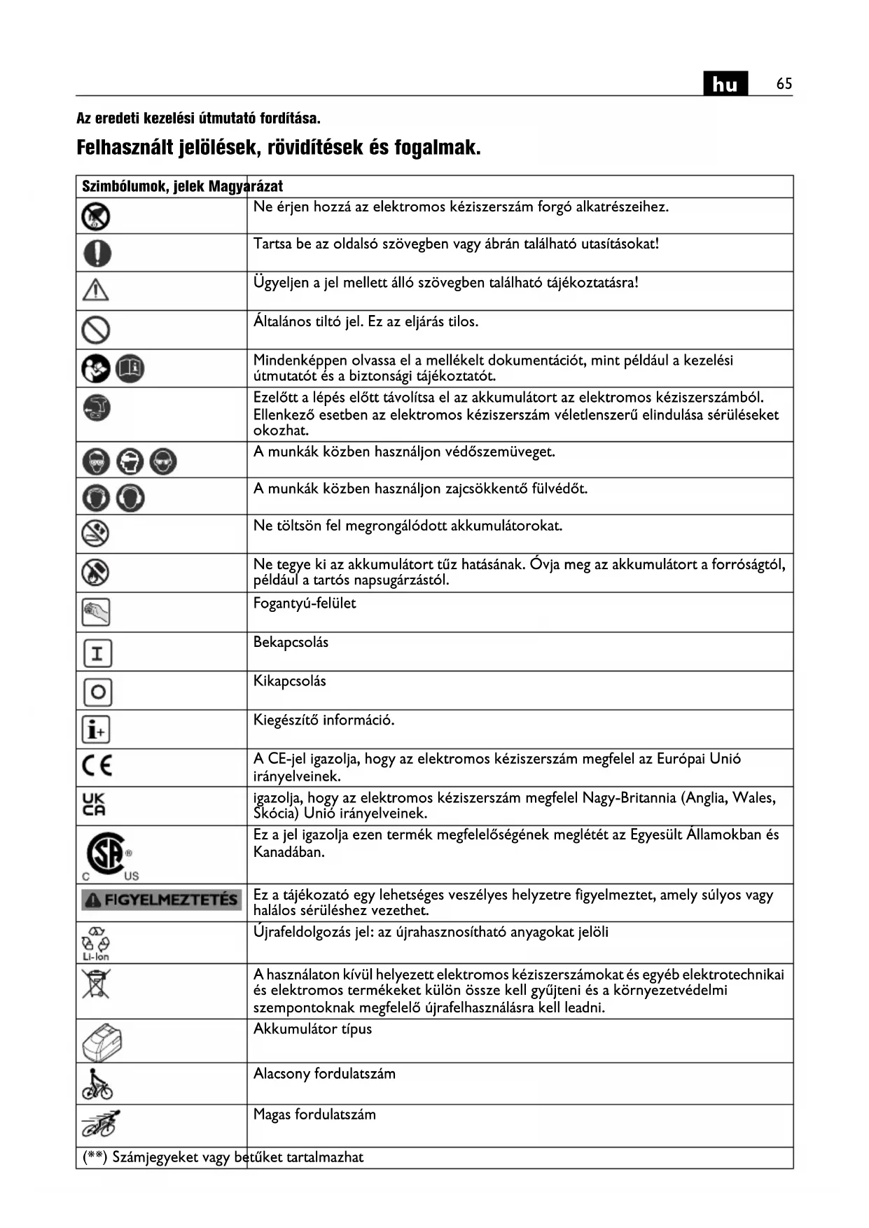 Az eredeti kezelési útmutató fordítása. Felhasznált jelölések, rövidítések és fogalmak. Szimbólumok, jelek Magyarázat Ne érjen hozzá az elektromos kéziszerszám forgó alkatrészeihez. Tartsa be az oldalsó szövegben vagy ábrán található utasításokat! Ügyeljen a jel mellett álló szövegben található tájékoztatásra! Általános tiltó jel. Ez az eljárás tilos. Mindenképpen olvassa el a mellékelt dokumentációt, mint például a kezelési útmutatót és a biztonsági tájékoztatót. Ezelőtt a lépés előtt távolítsa el az akkumulátort az elektromos kéziszerszámból. Ellenkező esetben az elektromos kéziszerszám véletlenszerű elindulása sérüléseket okozhat. A munkák közben használjon védőszemüveget. A munkák közben használjon zajcsökkentő fülvédőt. Ne töltsön fel megrongálódott akkumulátorokat. Ne tegye ki az akkumulátort tűz hatásának. Óvja meg az akkumulátort a forróságtól, például a tartós napsugárzástól. Fogantyú-felület Bekapcsolás Kikapcsolás Kiegészítő információ. A CE-jel igazolja, hogy az elektromos kéziszerszám megfelel az Európai Unió irányelveinek. igazolja, hogy az elektromos kéziszerszám megfelel Nagy-Britannia (Anglia, Wales, Skócia) Unió irányelveinek. Ez a jel igazolja ezen termék megfelelőségének meglétét az Egyesült Államokban és Kanadában. Ez a tájékozató egy lehetséges veszélyes helyzetre figyelmeztet, amely súlyos vagy halálos sérüléshez vezethet. Újrafeldolgozás jel: az újrahasznosítható anyagokat jelöli A használaton kívül helyezett elektromos kéziszerszámokat és egyéb elektrotechnikai és elektromos termékeket külön össze kell gyűjteni és a környezetvédelmi szempontoknak megfelelő újrafelhasználásra kell leadni. Akkumulátor típus Alacsony fordulatszám Magas fordulatszám (**) Számjegyeket vagy betűket tartalmazhat66